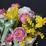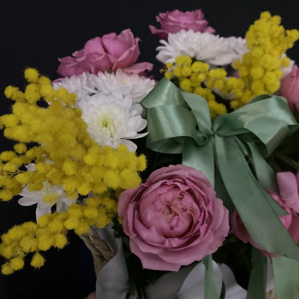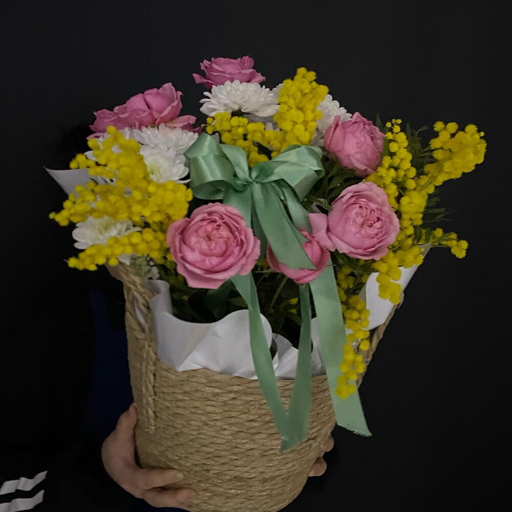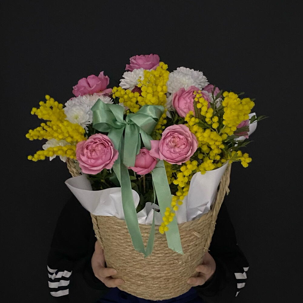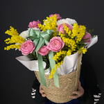 Мимоза - 1 шт. Писташ - 2 шт. Хризантема кустовая - 2 шт. Лента атласная - 1 шт. Роза Джульетта - 3 шт. Открыточка с вашими пожеланиями - 1 шт. Оазис флористический - 1 шт. Корзина ротанговая - 1 шт. утеплитель букета - 1 шт.