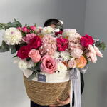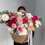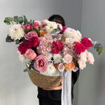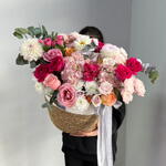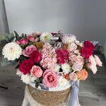 Корзина плетеная - 1 шт. Хризантема одноголовая белая - 2 шт. Оазис флористический - 2 шт. Эвкалипт Baby Blue - 5 шт. хризантемы кустовые - 7 шт. гортензии - 3 шт. розы эквадор - 19 шт. ленты атласные - 3 шт. спрей розы кустовые - 3 шт.