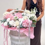 Хризантема кустовая - 3 шт. Корзина плетеная - 1 шт. Оазис флористический - 2 шт. Эвкалипт Цинерея - 3 шт. Гортензия Премиум Микс - 3 шт. плая вывернутая - 5 шт. маттиола белая(возможно замена на хризантемы) - 2 шт.