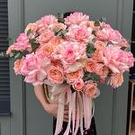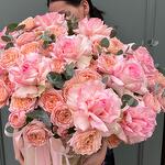 Эвкалипт - 5 шт. Лента атласная - 2 шт. французские розы - 11 шт. пионовидные розы джульетта дэвида остина - 19 шт. кашпо ротанг - 1 шт.