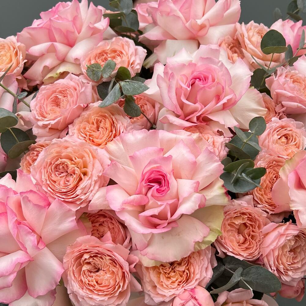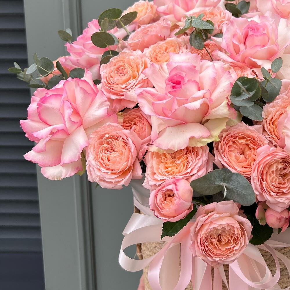 Эвкалипт - 5 шт. Лента атласная - 2 шт. французские розы - 11 шт. пионовидные розы джульетта дэвида остина - 19 шт. кашпо ротанг - 1 шт.