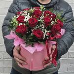 Гипсофила - 6 шт. Роза - 15 шт. Тишью - 3 шт. Шляпная коробка - 1 шт.