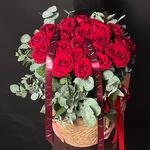 Изысканная композиция из бархатных красных роз в стильном кашпо — воплощение любви, страсти и утончённости. Нежная зелень эвкалипта добавляет лёгкости, свежести и изысканного аромата. Идеальный подарок для особого повода — когда хочется сказать о главном без слов.