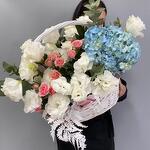 Гортензия - 1 шт. Лизиантус - 15 шт. Эвкалипт - 3 шт. Корзина плетеная - 1 шт. Спрей роза - 4 шт.