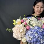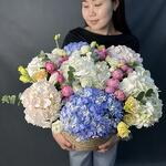 Гортензия - 7 шт. Лизиантус - 10 шт. Кустовая роза - 10 шт. Кашпо - 1 шт. Оазис флористический - 7 шт.