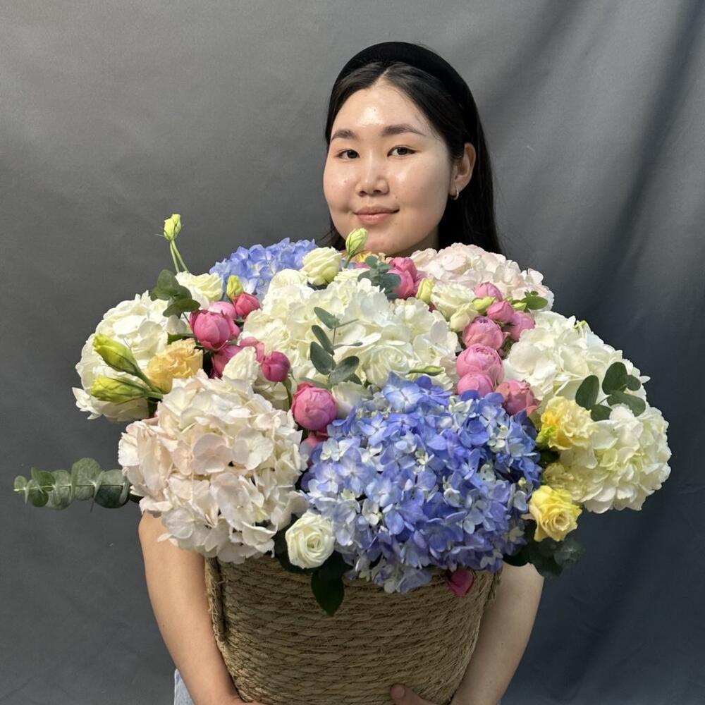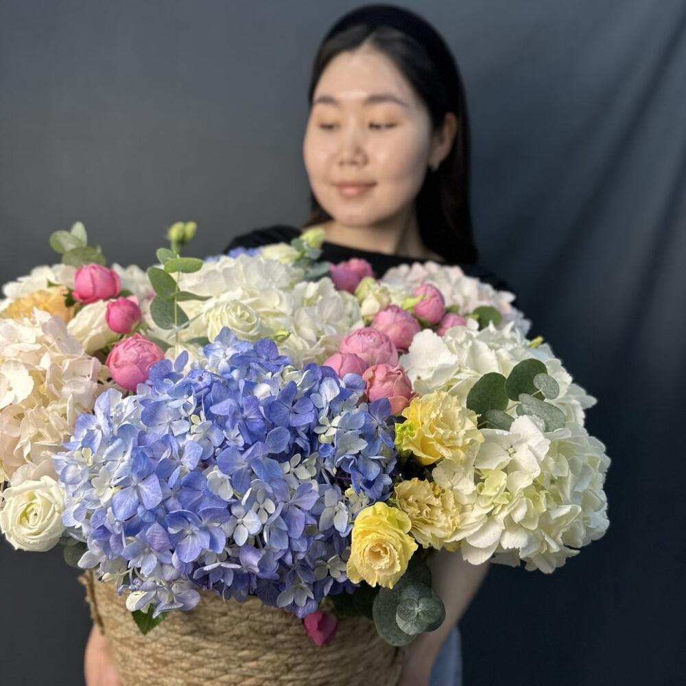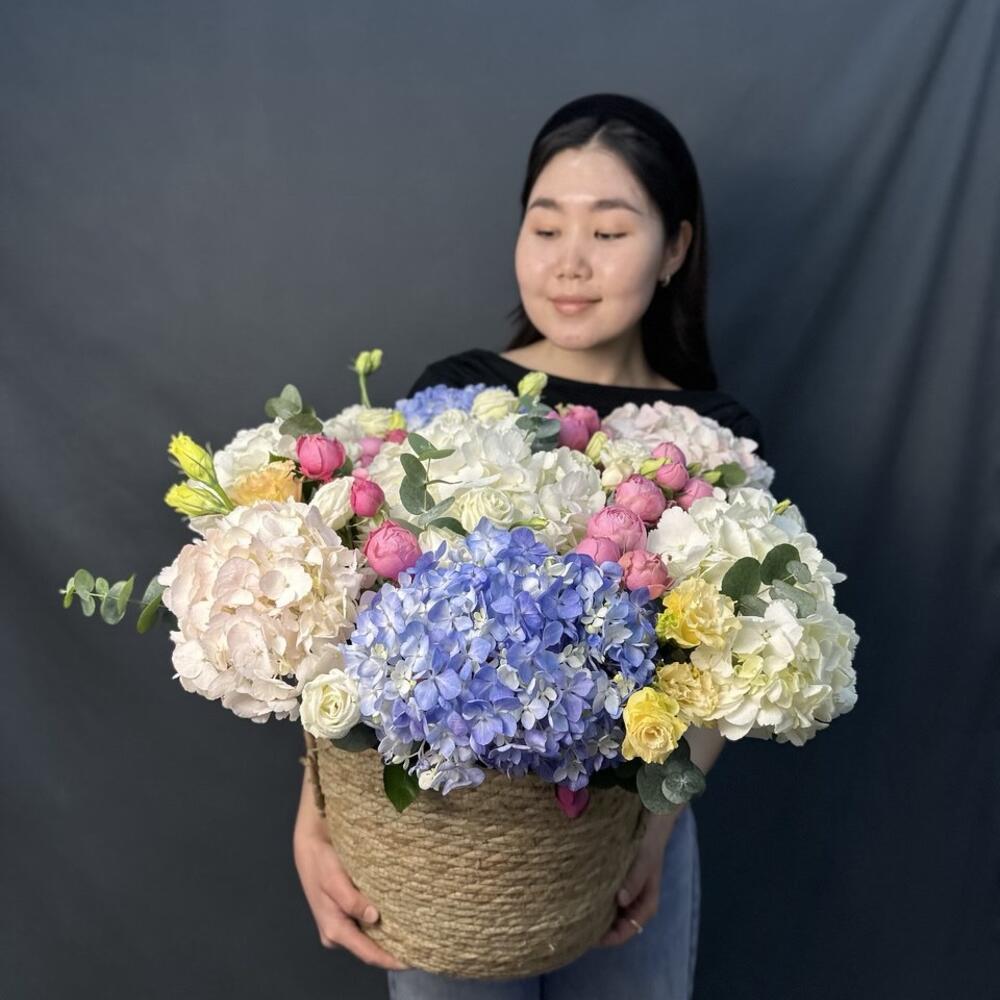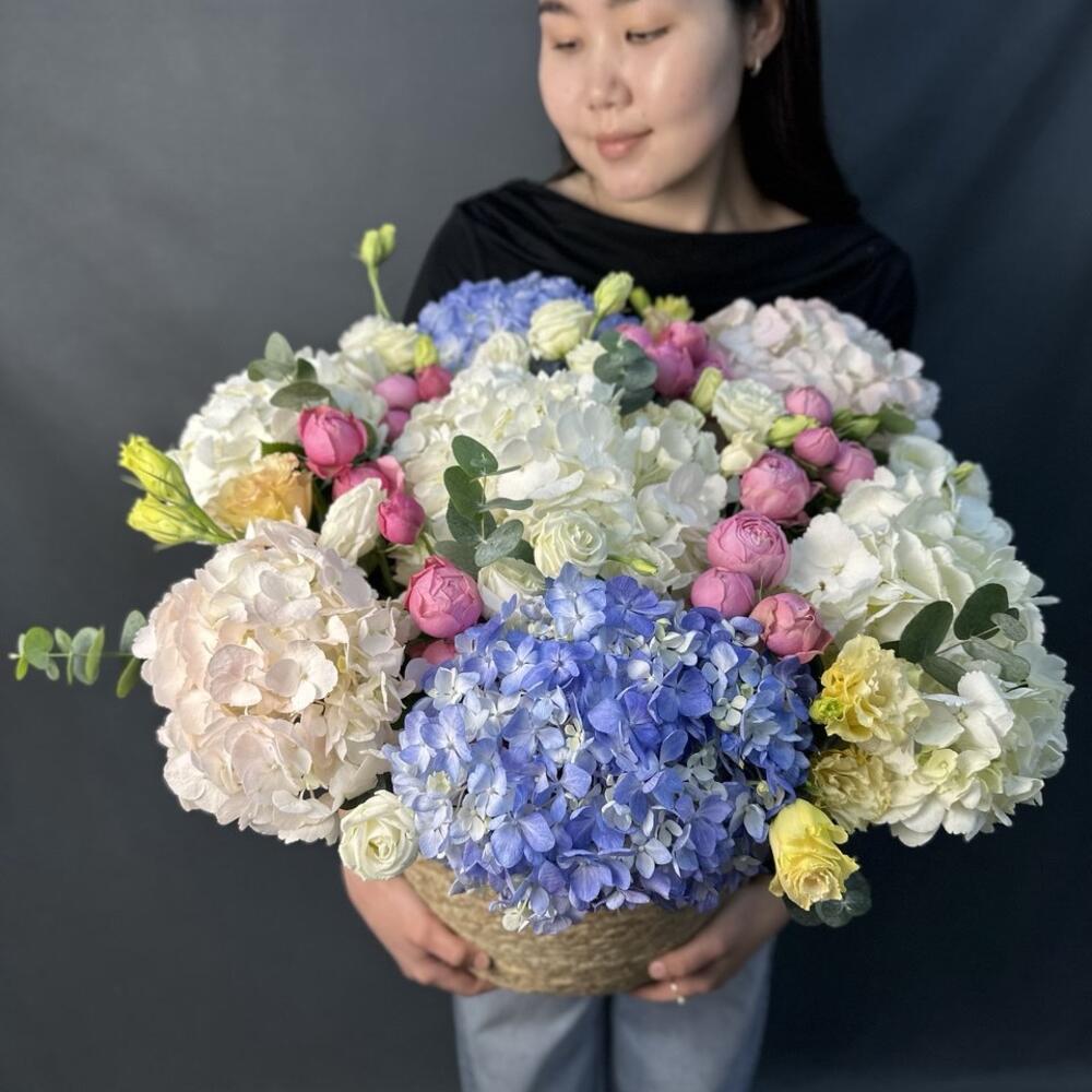 Обворожительная корзина из гортензий, кустовых роз и лизиантусов станет прекрасным подарком для любимого человека. Семь пышных гортензий, десять элегантных лизиантусов и десять роскошных кустовых роз вместе создают изумительную композицию, уместную в любой ситуации. Все цветы аккуратно расположены в прочном кашпо, обеспечивая им заботу и свежесть, а использование флористического оазиса гарантирует длительное сохранение их первозданного вида. Этот товар - идеальный выбор для тех, кто ценит красоту и гармонию в каждой детали.