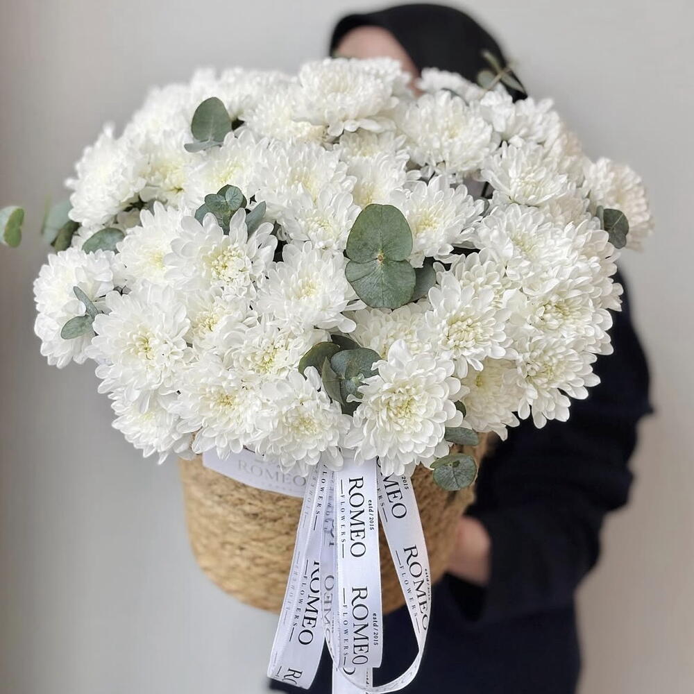 Этот изящный ансамбль свежих цветов представлен в стильной корзине и включает в себя пять веток ароматного эвкалипта и пять белоснежных хризантем. Он идеально подходит для того, чтобы выразить свои чувства, передать тепло и заботу близким людям. Сочетание цветов и зелени создает гармоничное и покоящее впечатление. Удивите своих близких или украсьте интерьер таким волшебным букетом.