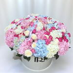 Роскошная цветочная композиция в стильной круглой коробке – это настоящий символ праздника и роскоши. Нежные оттенки розового, голубого, кремового и белого создают воздушное настроение и дарят ощущение утончённой гармонии. Гортензия придает объём и пышность, розы и пионовидные бутоны добавляют изысканности, а насыщенные малиновые акценты делают композицию выразительной. Такой подарок подчеркнёт важность момента и станет украшением любого торжества – от дня рождения до выпускного или свадьбы. Букет подарит море эмоций и станет настоящим центром внимания. Рекомендации по уходу: держите композицию вдали от прямых солнечных лучей и сквозняков, регулярно добавляйте воду в губку внутри коробки и обновляйте её каждые 2–3 дня.
