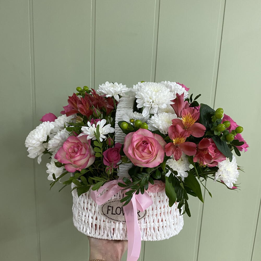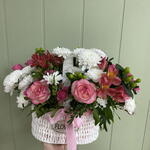 Альстромерия - 2 шт. Хризантема кустовая Белая - 3 шт. Гиперикум зеленый - 4 шт. фисташка зелень - 2 шт. роза джумеля - 5 шт. Роза кустовая Софи - 3 шт.