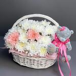 Хризантема кустовая - 5 шт. Мягкая игрушка - 1 шт. Корзина плетеная - 1 шт.