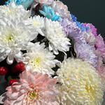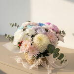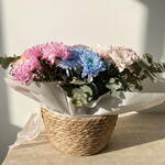 Элегантная корзина с цветами - идеальный способ подарить удовольствие. В ее составе - 8 штук пышных хризантем, дополняемых ярким жарким пунктом в виде красного гиперикума. Легкие штрихи пистации и благородные листья эвкалипта ценерея добавляют букету свежести и уникального шарма. Всё это красиво упаковано в дизайнерскую пленку и умещено в экологичном кашпо из водорослей. Нежная одноголовая хризантема Магнум цвета шампанского является центром композиции, а завершила наше флористическое произведение арт-искусство - изящный бант из ленты с бусинами.