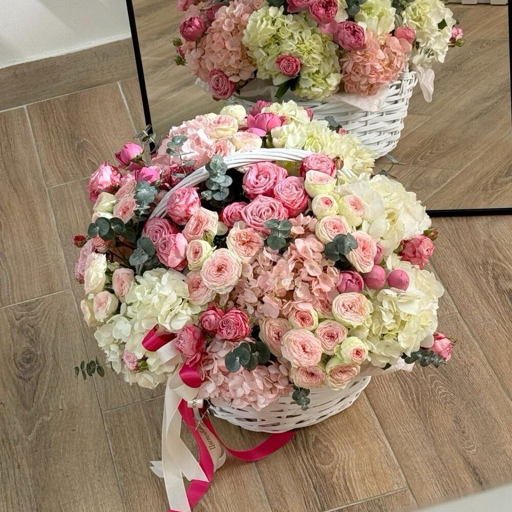 Невероятная дофаминовая корзина с миксом из кустовых бомбастиков и шариками гортензии. Прекрасный вариант чтобы удивить и создать атмосферу ✨🤍
