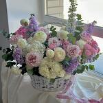 Гортензия - 7 шт. Дельфиниум - 2 шт. Маттиола - 7 шт. Роза - 10 шт. Кустовая роза - 6 шт. Хризантема - 10 шт. Диантус - 10 шт. Ранункулюс - 9 шт. Эвкалипт Baby Blue - 10 шт.