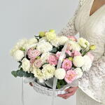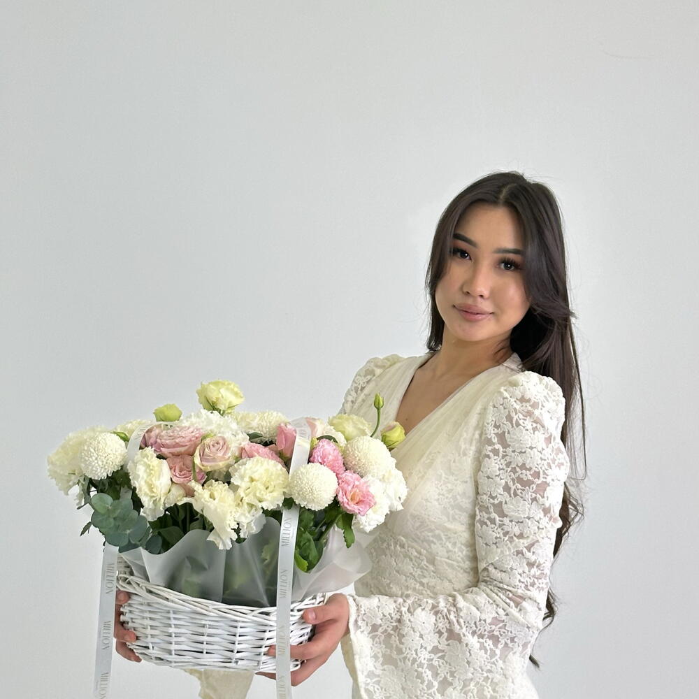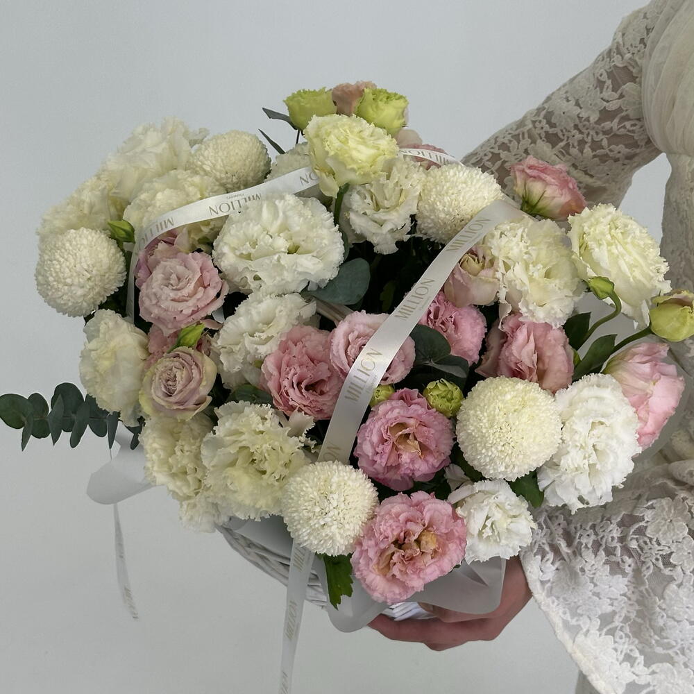 Корзина с эустомой Момоко Нежная цветочная корзина из эустомы сорта Момоко — утончённая композиция с мягкими пастельными оттенками и воздушной текстурой. Изящные бутоны создают гармоничный объём и долго сохраняют свежесть, наполняя подарок лёгкостью и теплом.