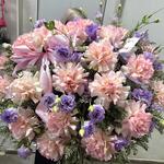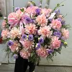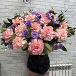 Лизиантус - 10 шт. Лента атласная - 2 шт. Корзина плетеная - 1 шт. Французская роза - 25 шт. Оазис флористический - 3 шт. Салал пучок - 10 шт.
