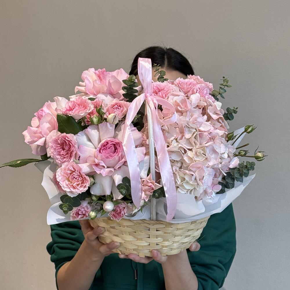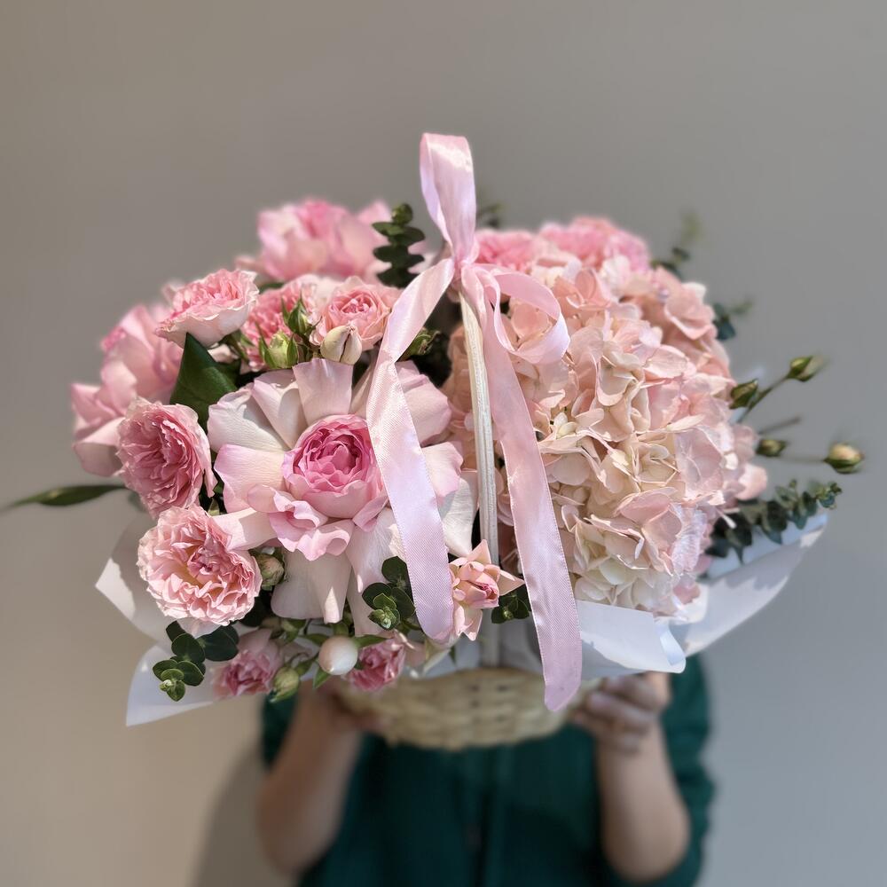 Гортензия - 1 шт. Корзина - 1 шт. Эвкалипт - 5 шт. Оазис флористический - 1 шт. Спрей роза - 3 шт. французские розы - 3 шт.
