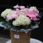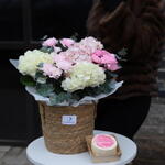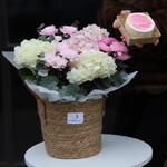 Гортензия - 4 шт. Хризантема кустовая - 3 шт. Эвкалипт - 5 шт. бенто торт - 1 шт.