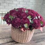 Эвкалипт - 5 шт. Корзина ручной работы - 1 шт. Оазис флористический - 2 шт. хризантема бигуди фиолетовая - 19 шт.