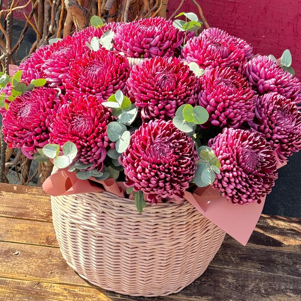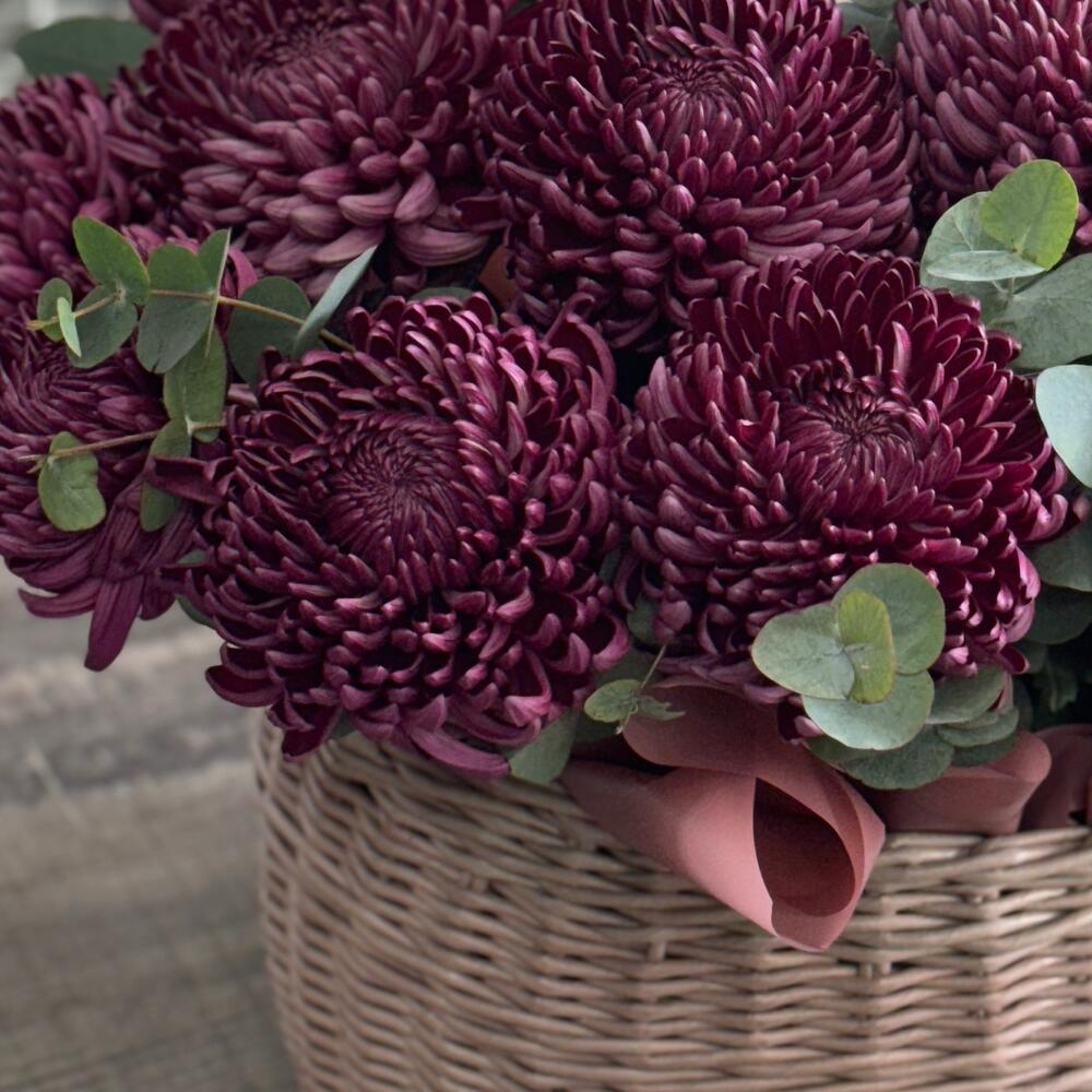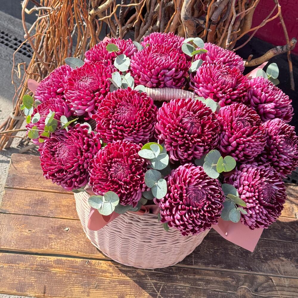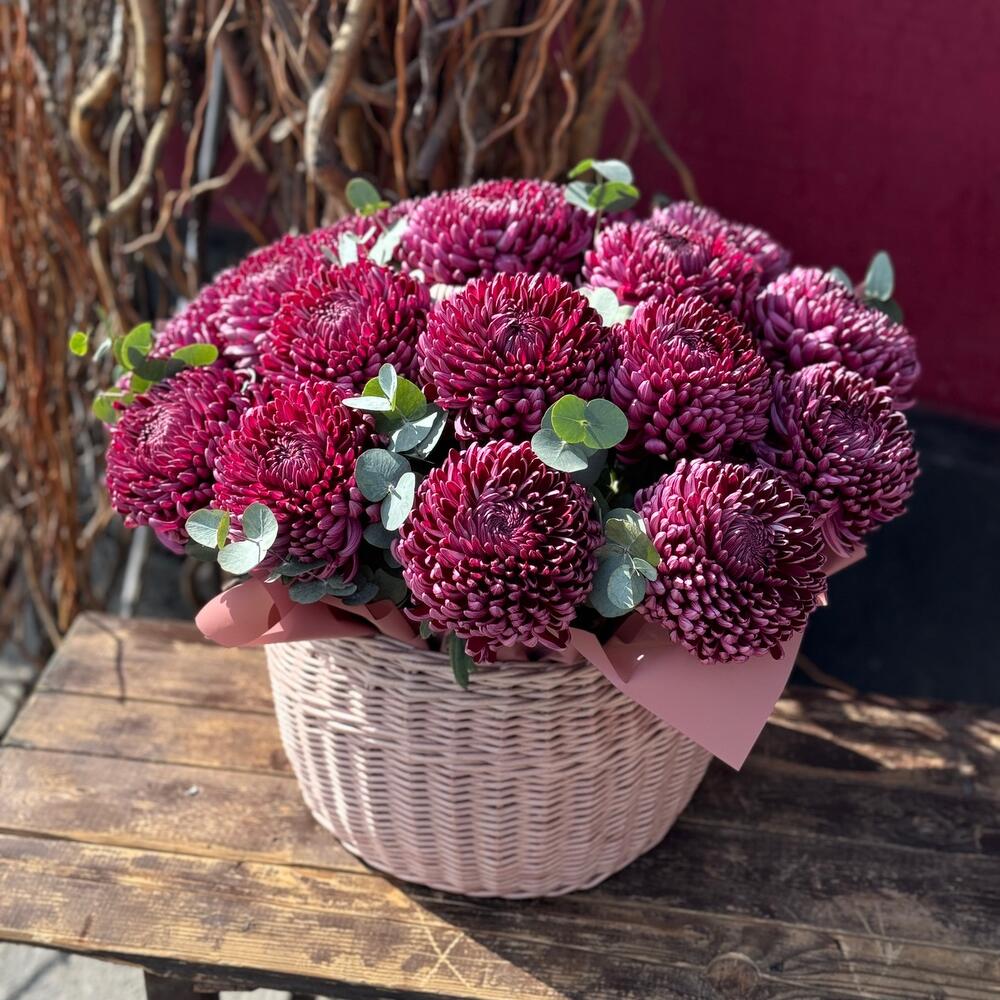 Эвкалипт - 5 шт. Корзина ручной работы - 1 шт. Оазис флористический - 2 шт. хризантема бигуди фиолетовая - 19 шт.