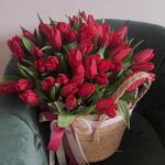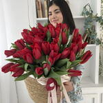 Лента атласная - 2 шт. ротанговое кашпо - 1 шт. тюльпаны красные сортовые - 51 шт.