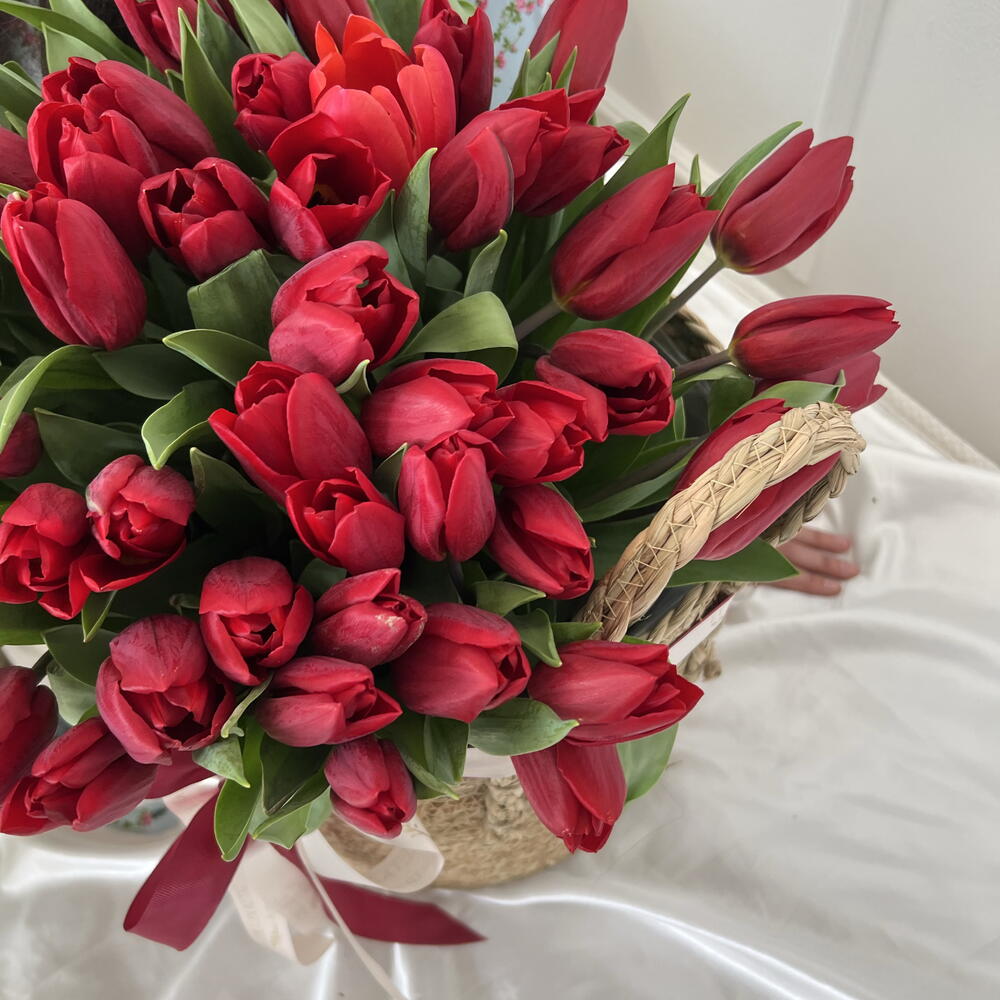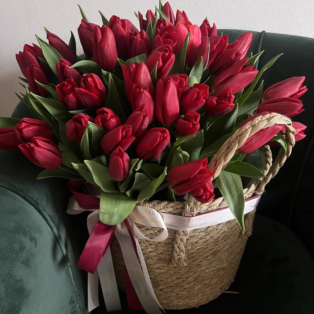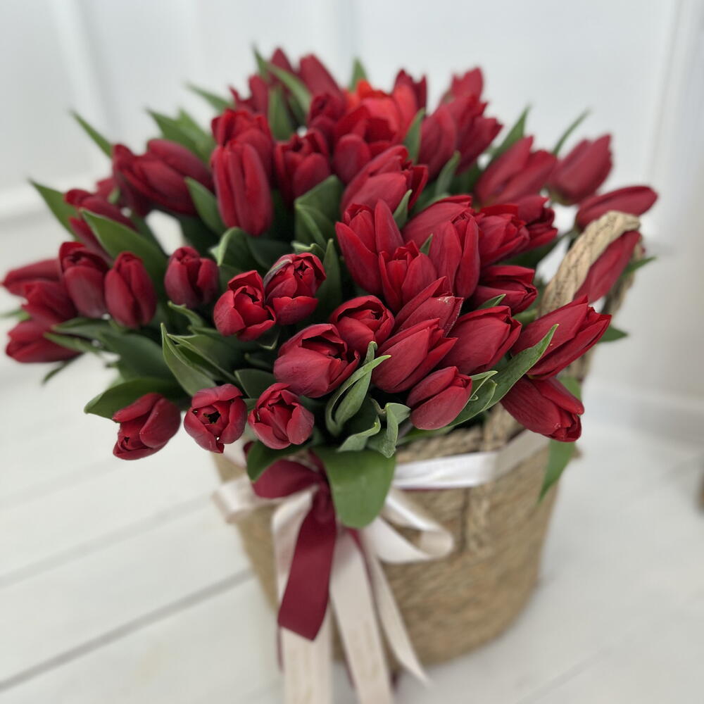 Лента атласная - 2 шт. ротанговое кашпо - 1 шт. тюльпаны красные сортовые - 51 шт.