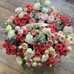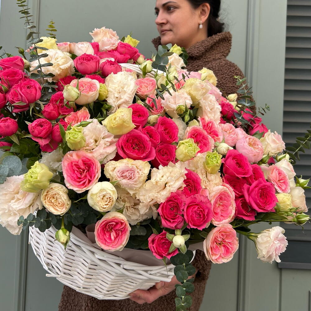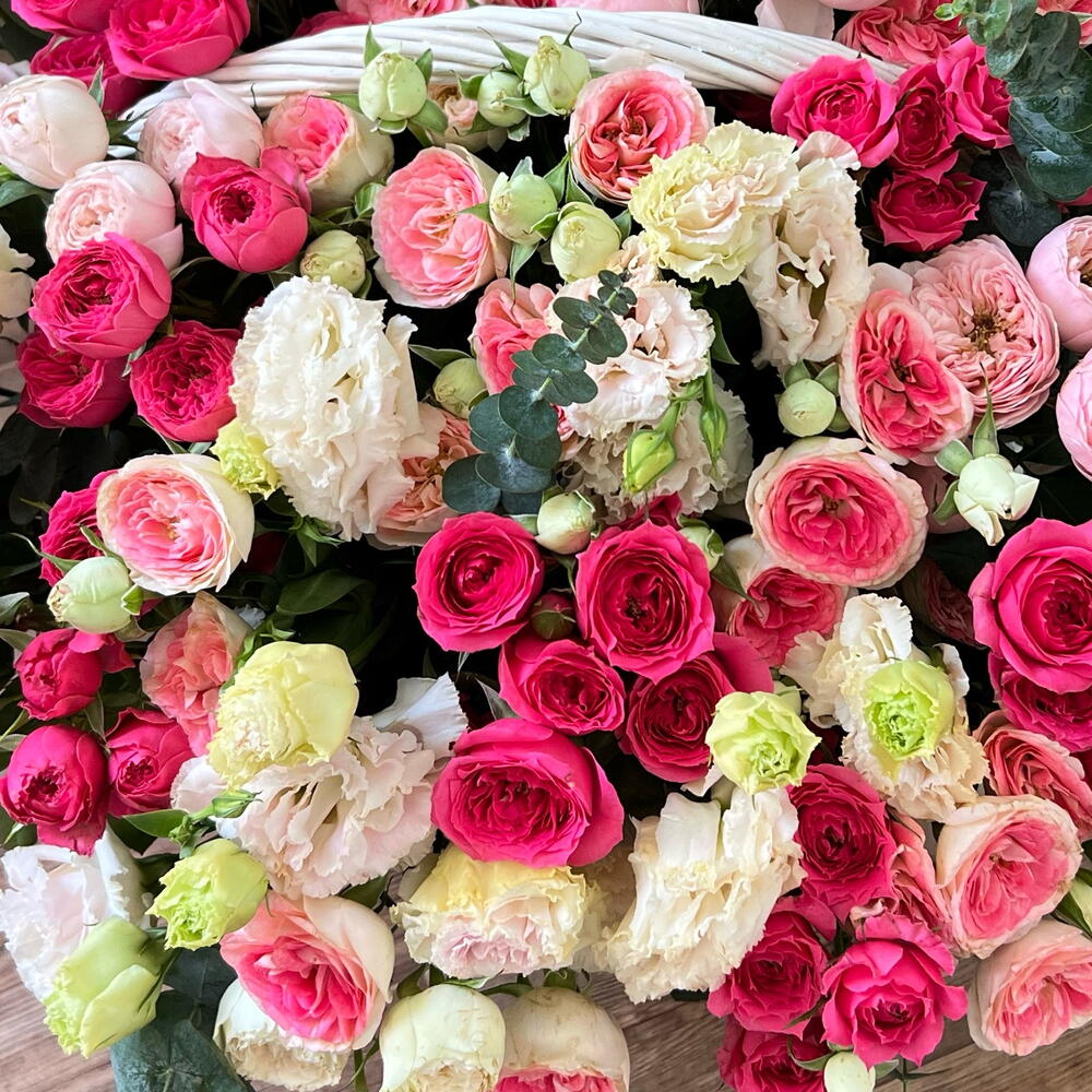 Эвкалипт - 5 шт. кустовые розы микс - 10 шт. кустовые розы малиновые - 10 шт. корзина плетёная ручной работы - 1 шт. лизиантус бело/розовый - 11 шт.