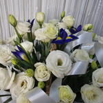 Ирис - 5 шт. Корзина - 1 шт. Лизиантус Белый - 11 шт. Оазис флористический - 1 шт. Калька упаковка - 2 шт.