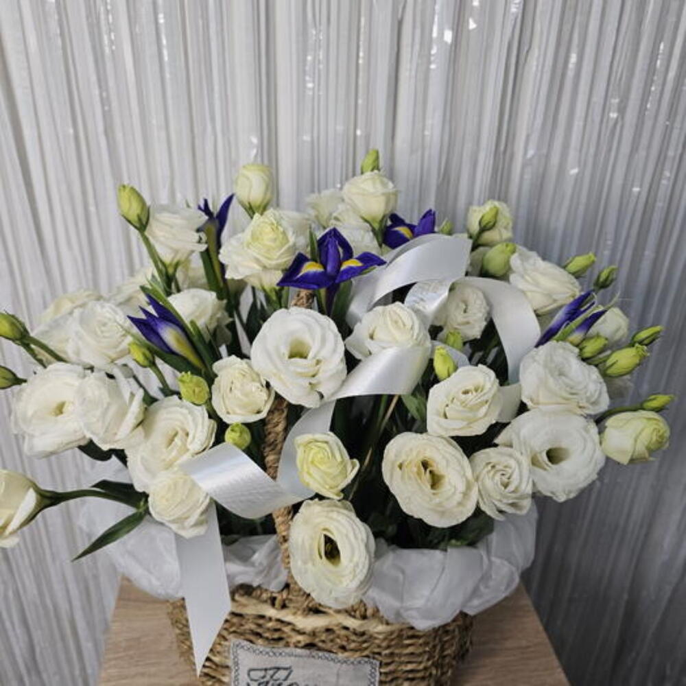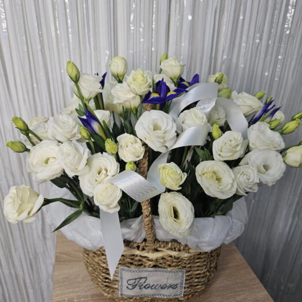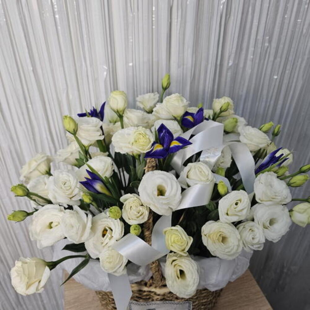 Ирис - 5 шт. Корзина - 1 шт. Лизиантус Белый - 11 шт. Оазис флористический - 1 шт. Калька упаковка - 2 шт.