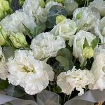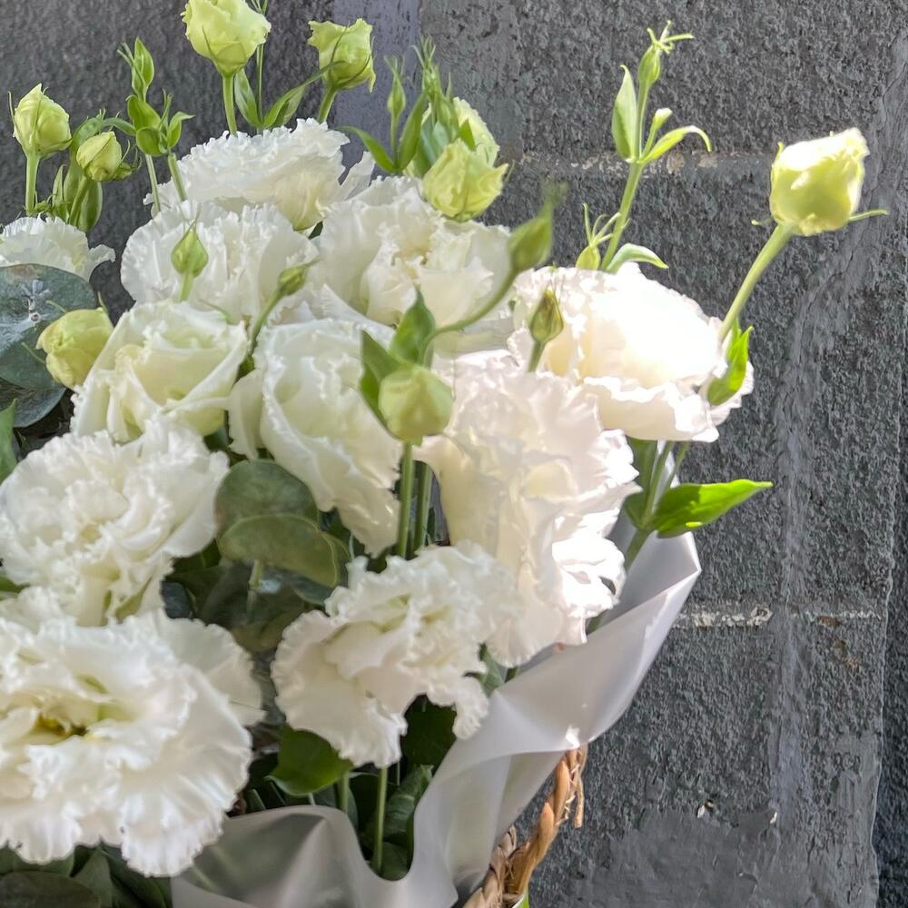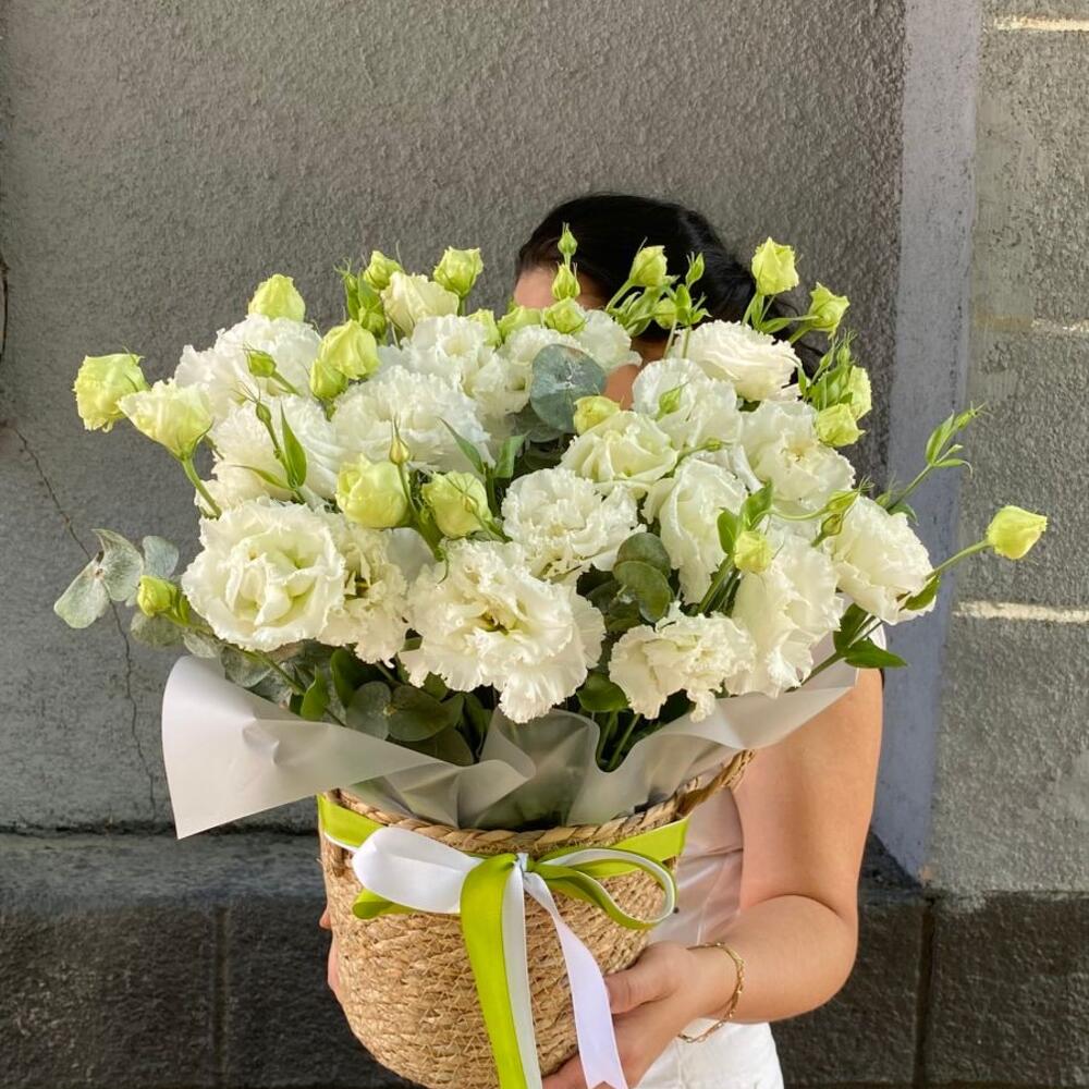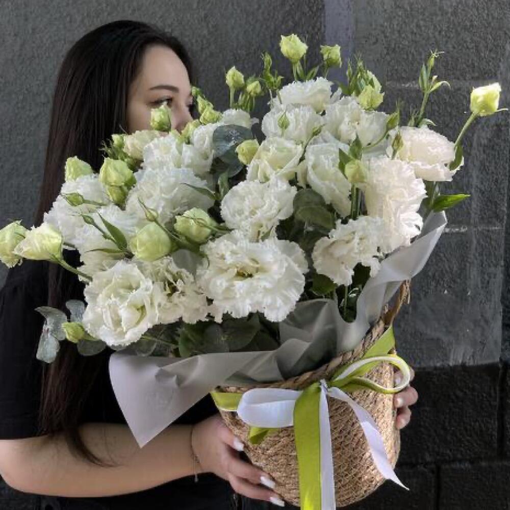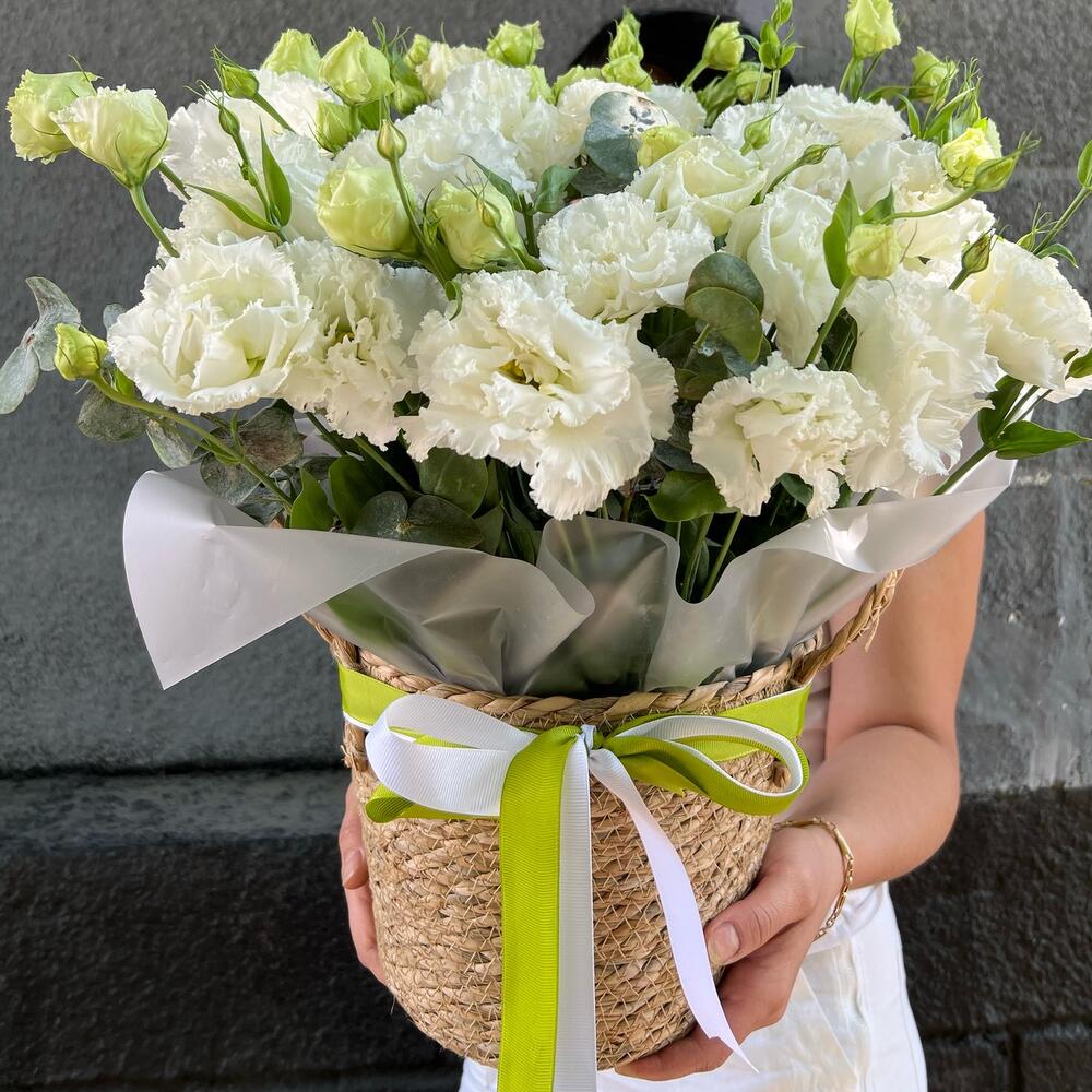 Эвкалипт - 3 шт. Лента репсовая - 2 шт. кашпо из ротанга - 1 шт. лизиантус махровый белый алиса - 11 шт.