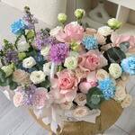 Гортензия - 1 шт. Эвкалипт - 2 шт. Роза - 5 шт. Кустовая роза - 4 шт. Гвоздика - 5 шт. Эустома - 4 шт.