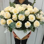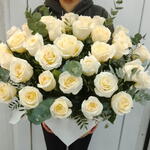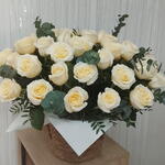 Кашпо - 1 шт. Пионовидная роза - 35 шт. Фисташка пучок - 1 шт. Оазис флористический - 2 шт. Эвкалипт Цинерея - 2 шт. бумага дизайнерская - 2 шт.