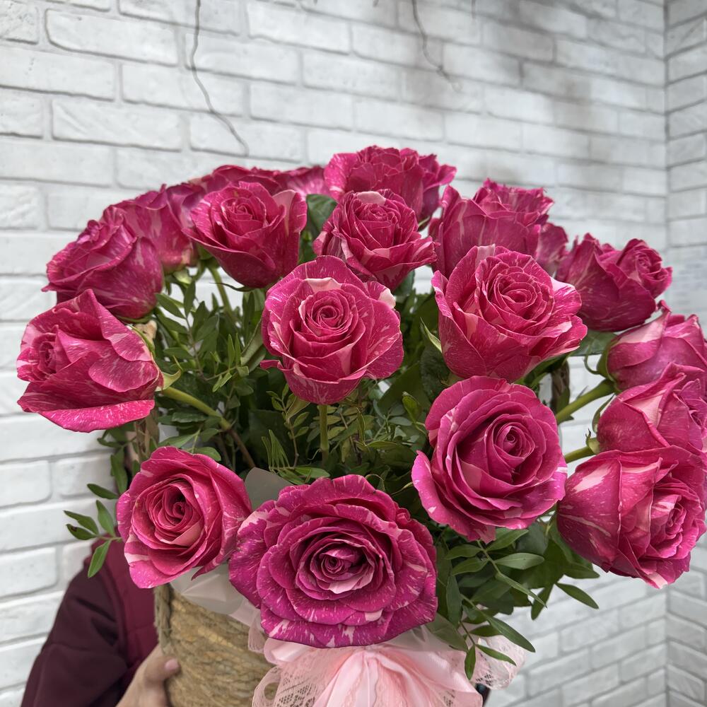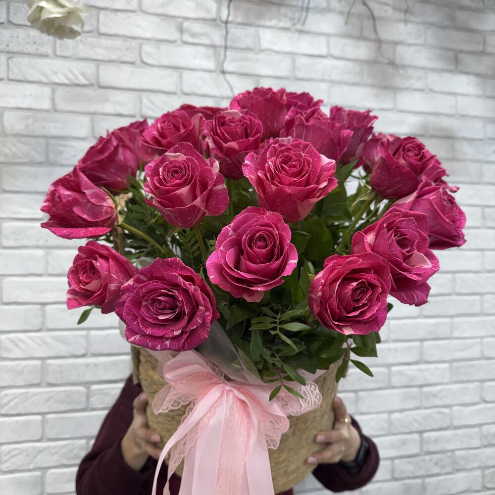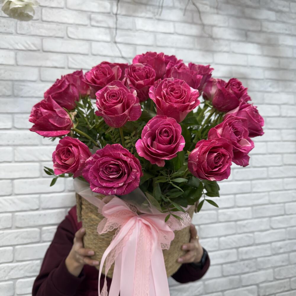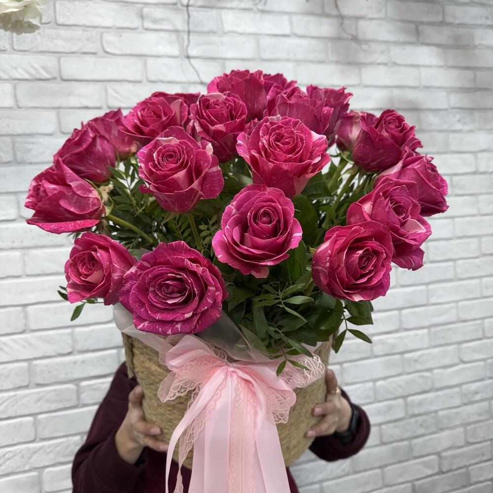 Лента атласная - 2 шт. Кашпо - 1 шт. Оазис флористический - 2 шт. зелень фисташка - 5 шт. розы эквадор (60 см) - 25 шт.