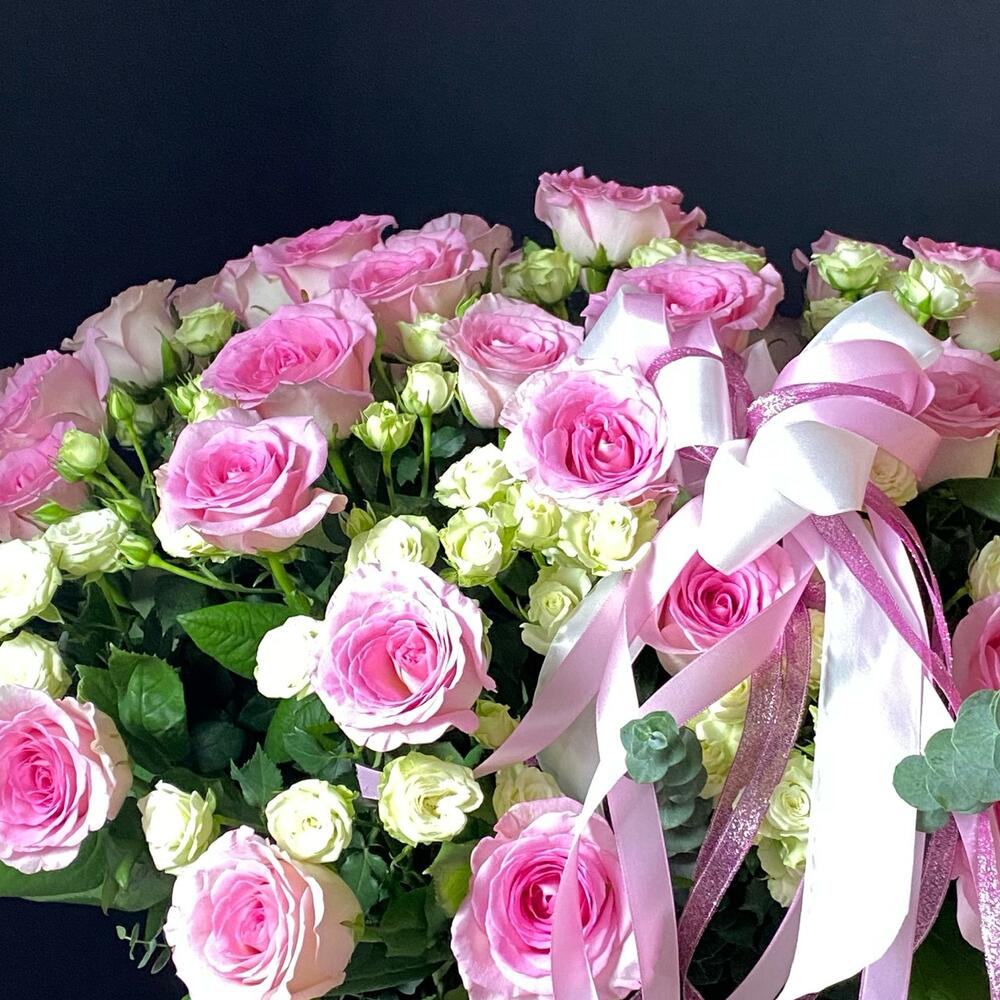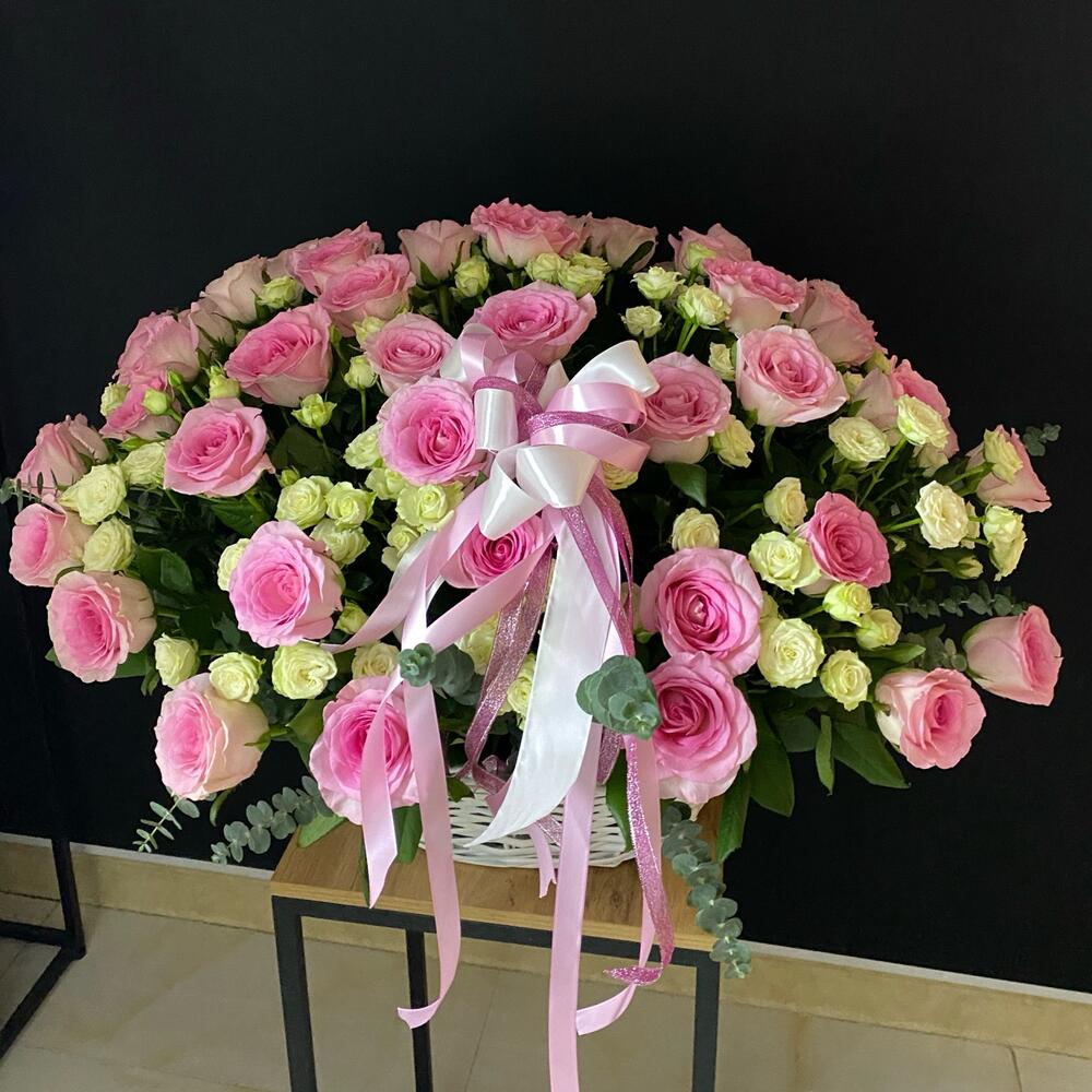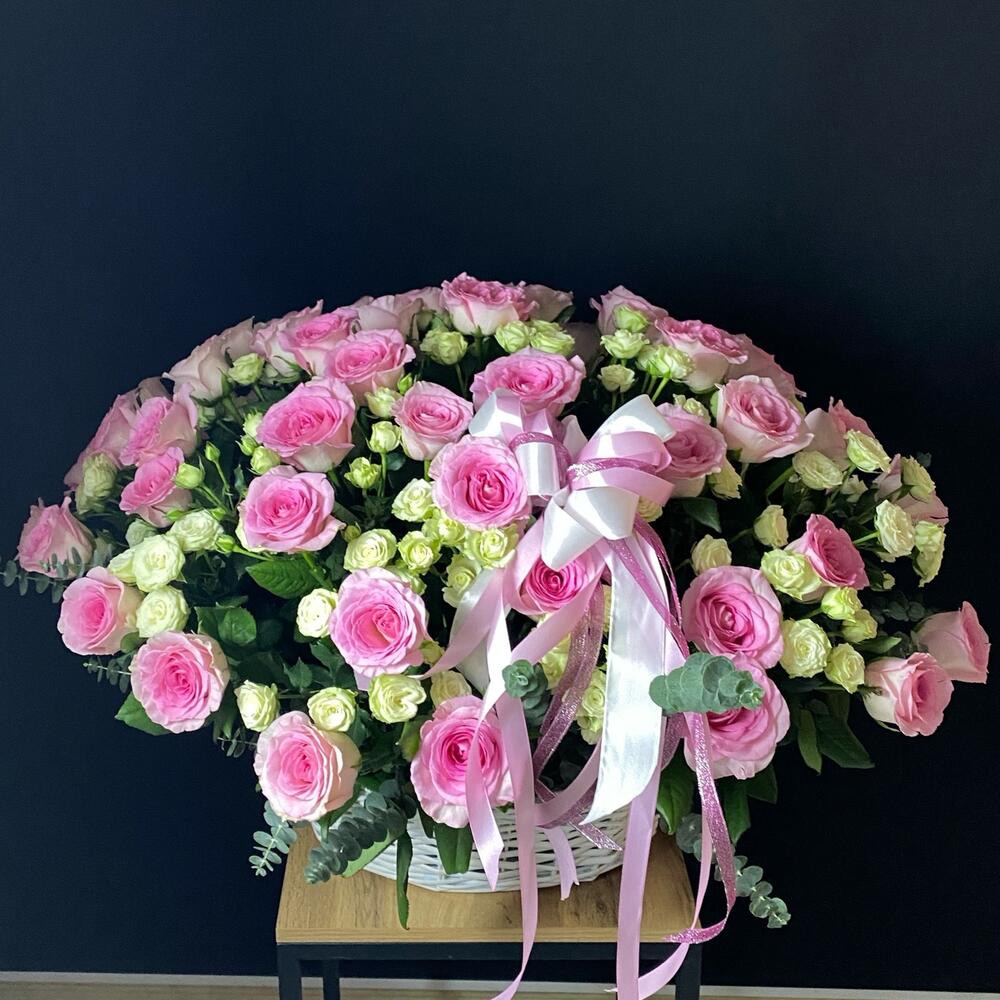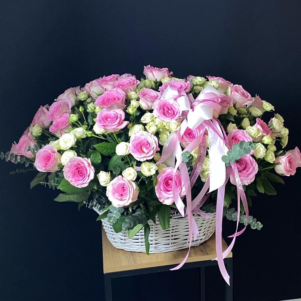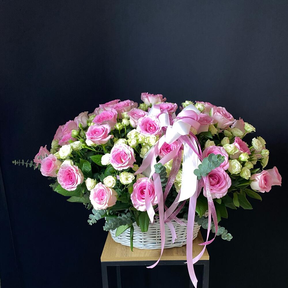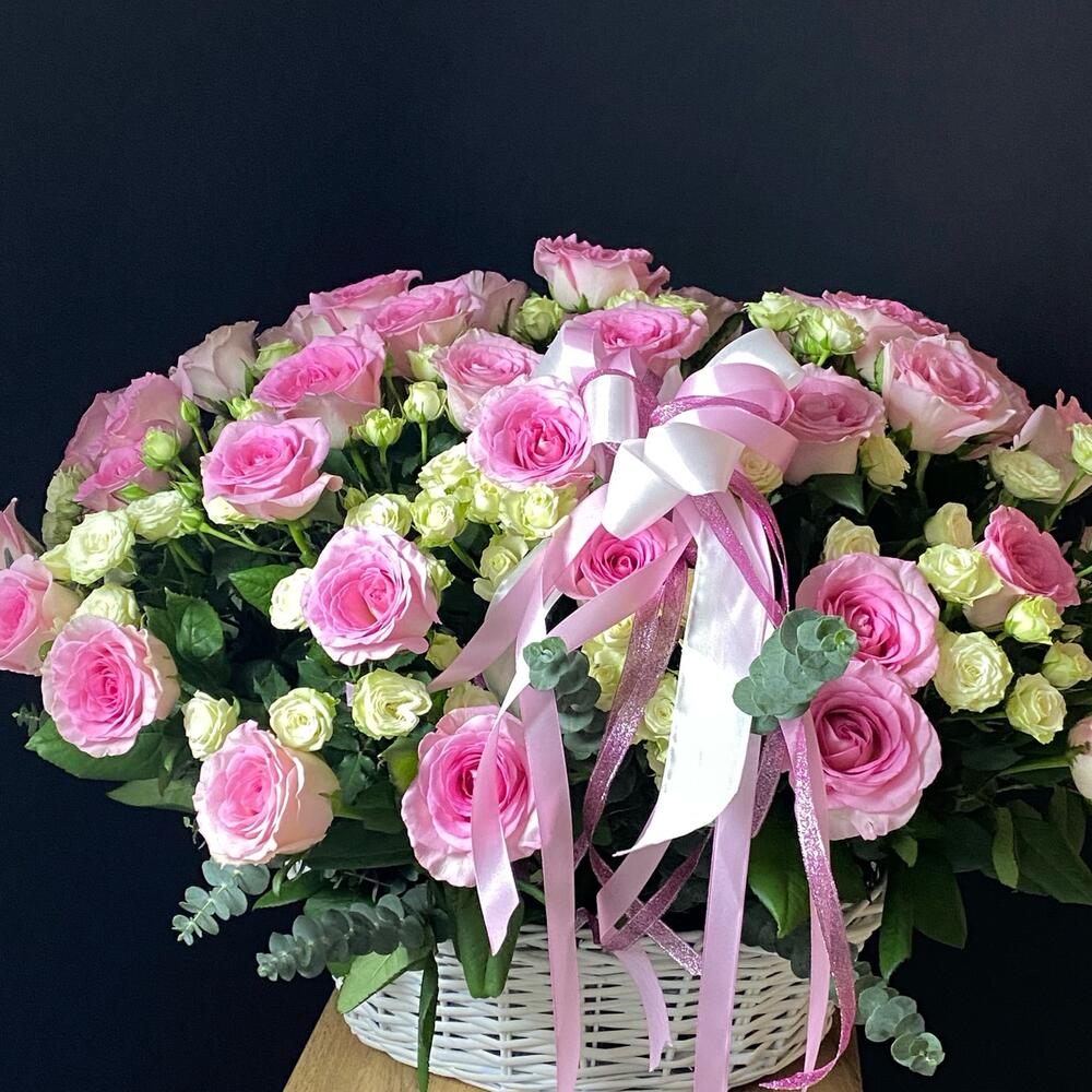 Роза кустовая - 21 шт. Эвкалипт - 4 шт. Роза одноголовая - 55 шт. Лента атласная - 3 шт. Оазис флористический - 3 шт. корзина плетеная 40 см - 1 шт. открытка с вашими пожеланиями - 1 шт.