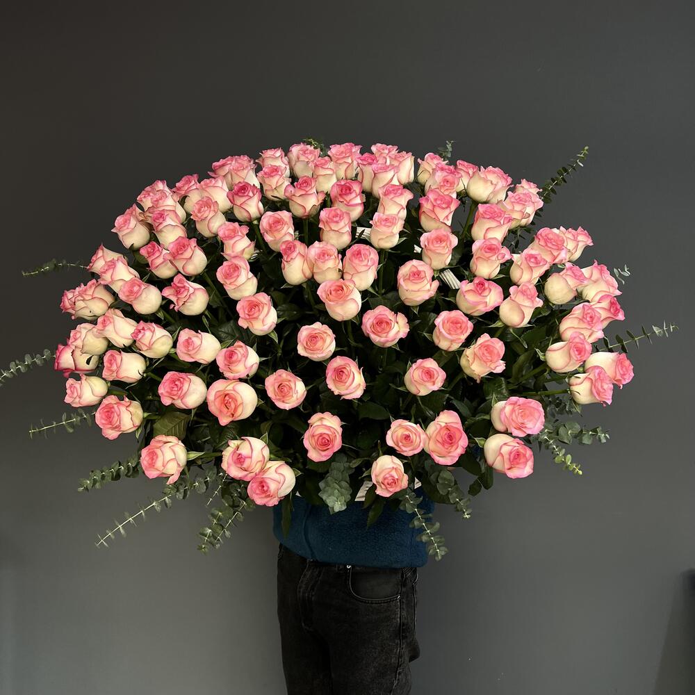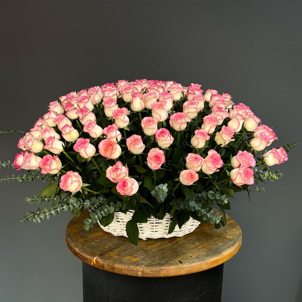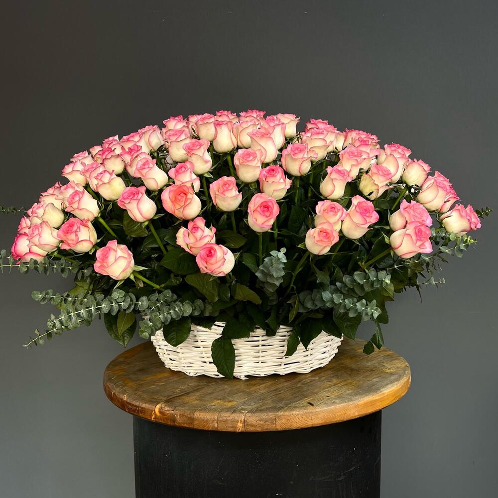 Корзина - 1 шт. Роза Джумилия - 101 шт. Эвкалипт Микс - 21 шт.