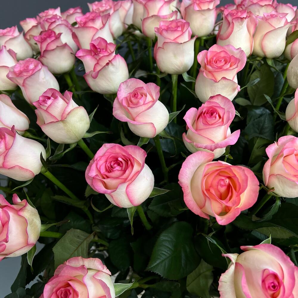Корзина с розами сорта «Джумилия» 101шт с эвкалиптом