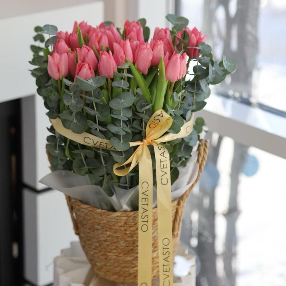 Корзина с розовыми тюльпанами