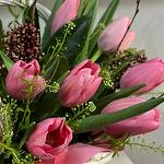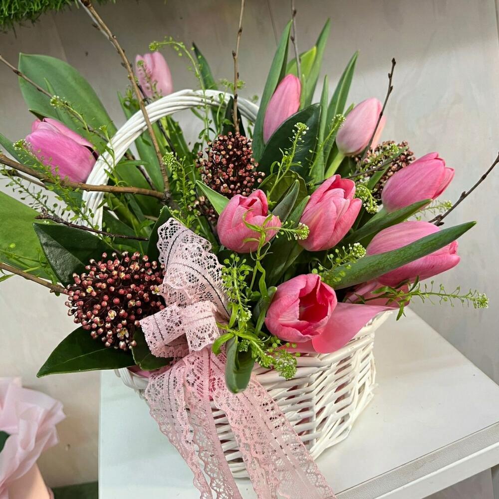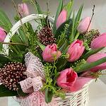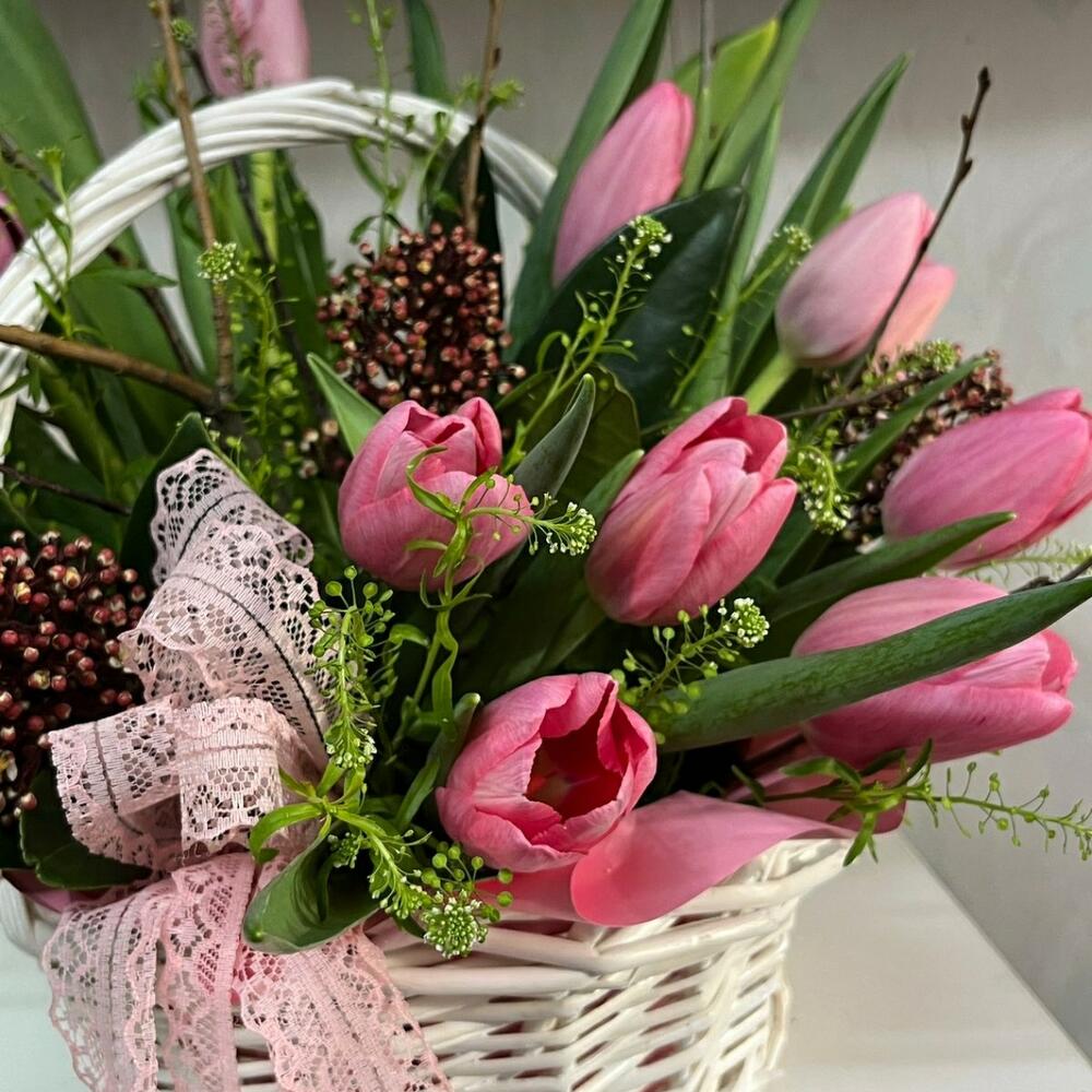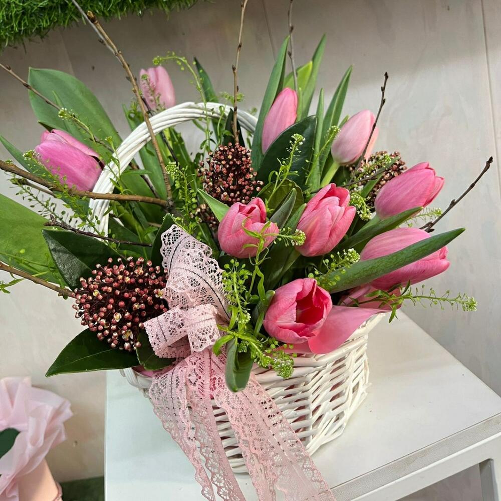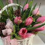 Упаковка - 1 шт. Скиммия - 1 шт. Корзина плетеная - 1 шт. Тласпи Green Bell - 1 шт. Оазис флористический - 1 шт. тюльпаны розовые - 9 шт. ветки с почками - 3 шт.