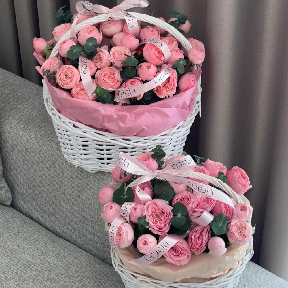 Корзина плетеная - 1 шт. Оазис флористический - 1 шт. mensfield park кустовая пионовидная роза - 7 шт.