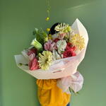 Роза - 5 шт. Гербера - 3 шт. Лилия Белая - 1 шт. эустома розовая - 3 шт. Молюцелла - 1 шт. онцидиум - 1 шт.