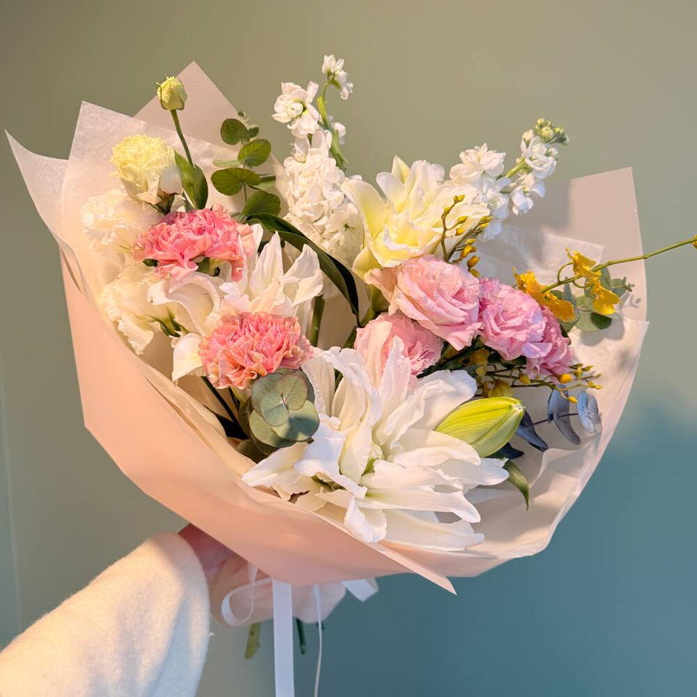 Лилия - 1 шт. Маттиола - 2 шт. Эвкалипт - 1 шт. Эустома - 2 шт. Диантус - 3 шт. онцидиум - 1 шт.