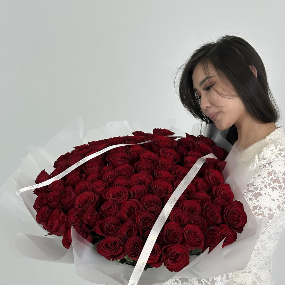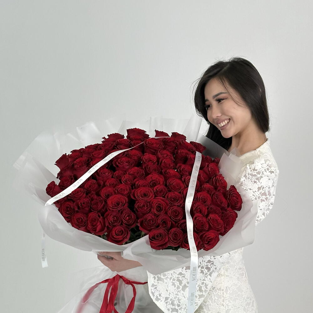 Букет из 101 красной розы Роскошный букет из 101 свежей красной розы — классический символ любви, страсти и глубоких чувств. Эффектная композиция производит сильное впечатление и идеально подходит для признания в любви, годовщины, дня рождения или особенного сюрприза без повода. Флористы Million.floral собирают каждый букет вручную непосредственно перед доставкой. Мы используем только свежие розы высокого качества, чтобы букет радовал насыщенным цветом, ароматом и стойкостью как можно дольше.