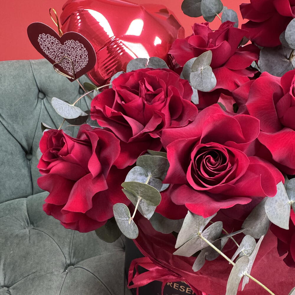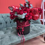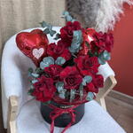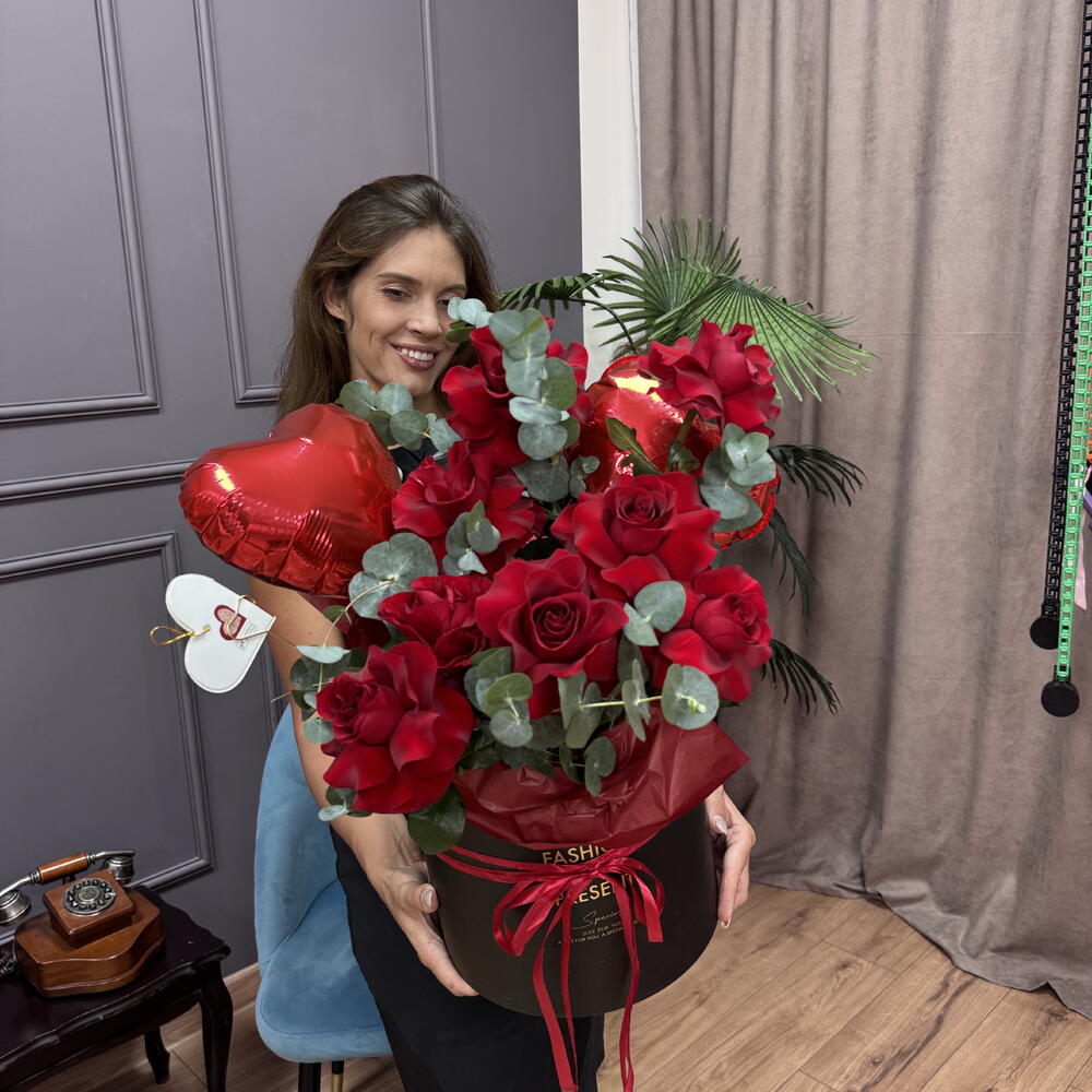 Коробка шляпная - 1 шт. Французская роза - 11 шт. валентинка - 1 шт. шар сердце фольга - 2 шт.
