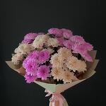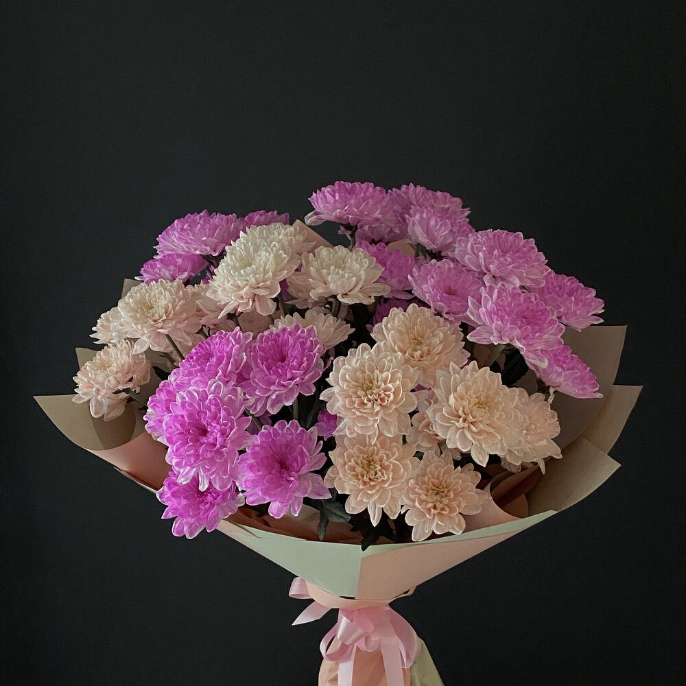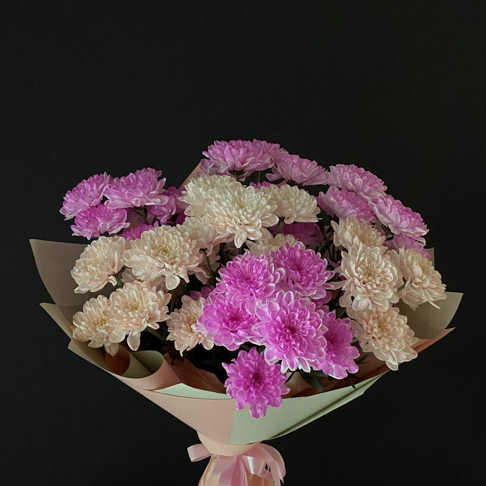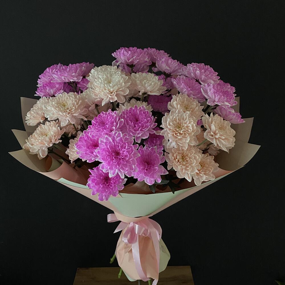 Хризантема кустовая - 7 шт. Открыточка с вашими пожеланиями - 1 шт. Оформление матовая пленка - 1 шт.