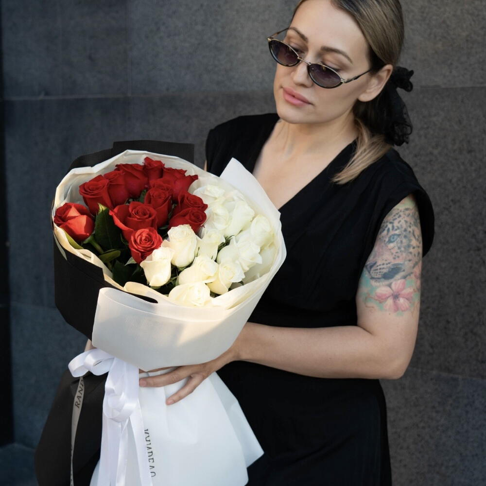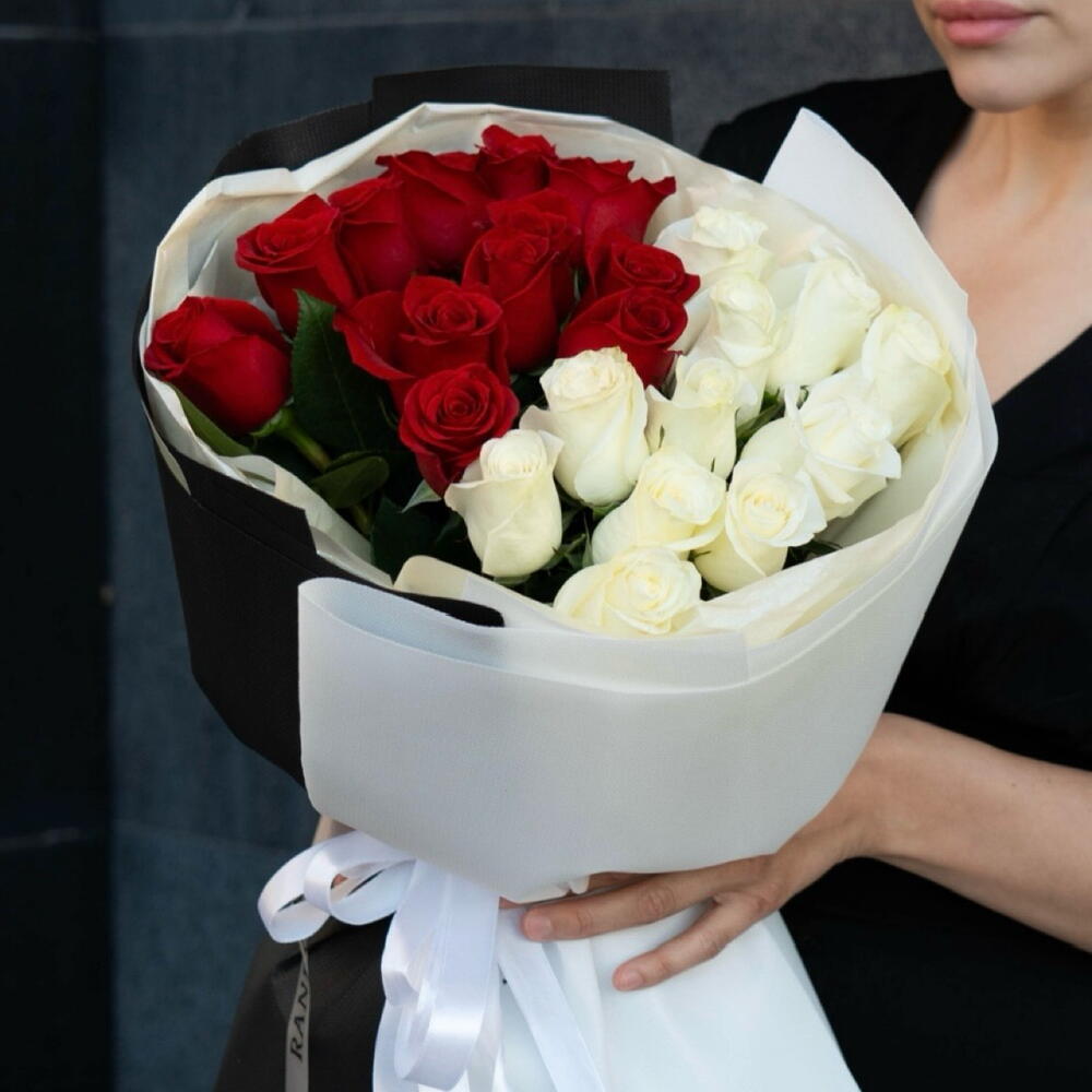 Стильный букет классических роз в сочетании красных и белых придает элегантность букету.