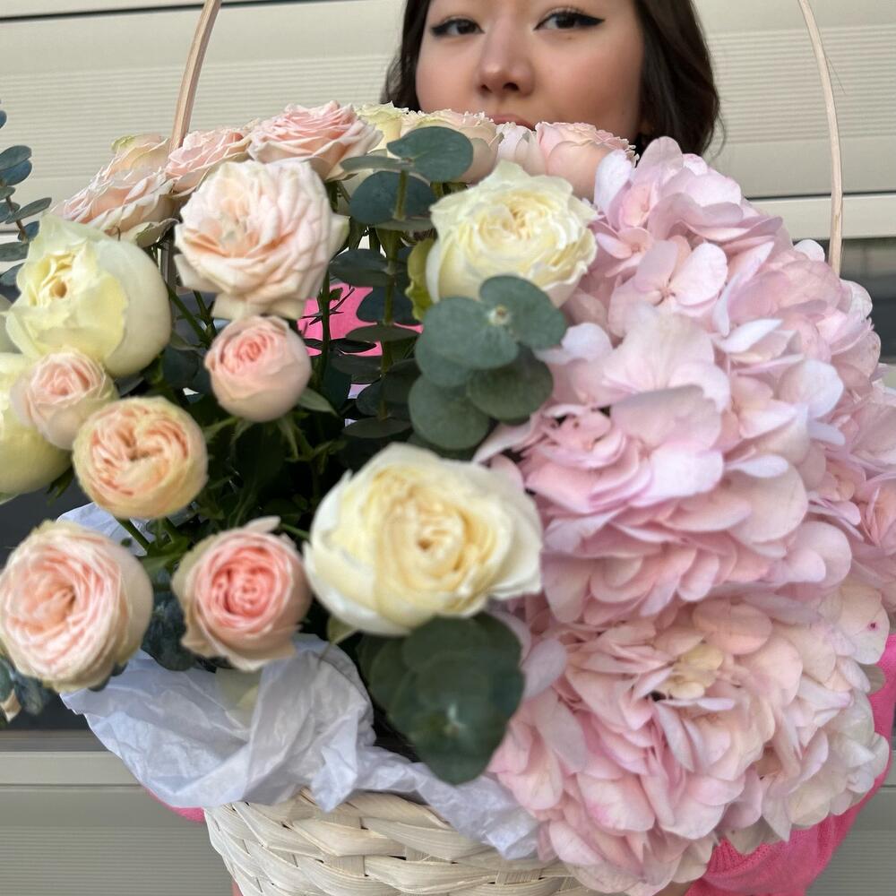 Гортензия - 1 шт. Эвкалипт - 3 шт. Кустовая роза - 5 шт.