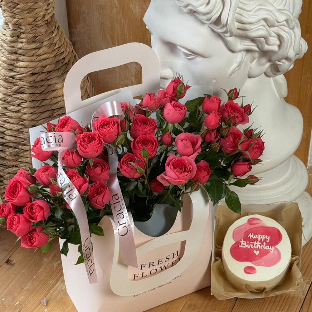 Кустовые розы с бенто тортиком в сумочке