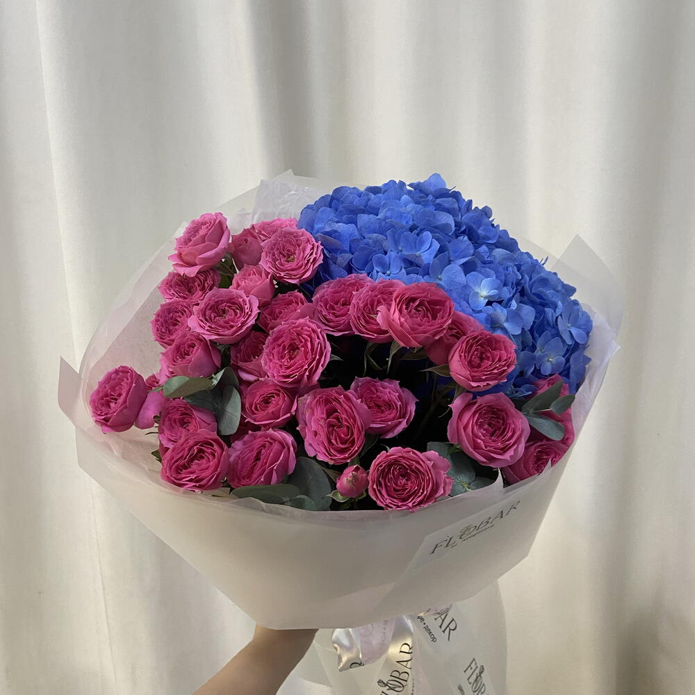 Гортензия - 1 шт. Кустовая роза - 6 шт. Упаковка - 1 шт. Эвкалипт Цинерея - 1 шт.
