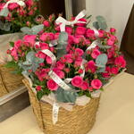 Оазис флористический - 2 шт. Эвкалипт Цинерея - 2 шт. фирменное оформление - 1 шт. кашпо ротанг - 1 шт. sofie кустовая роза - 11 шт.