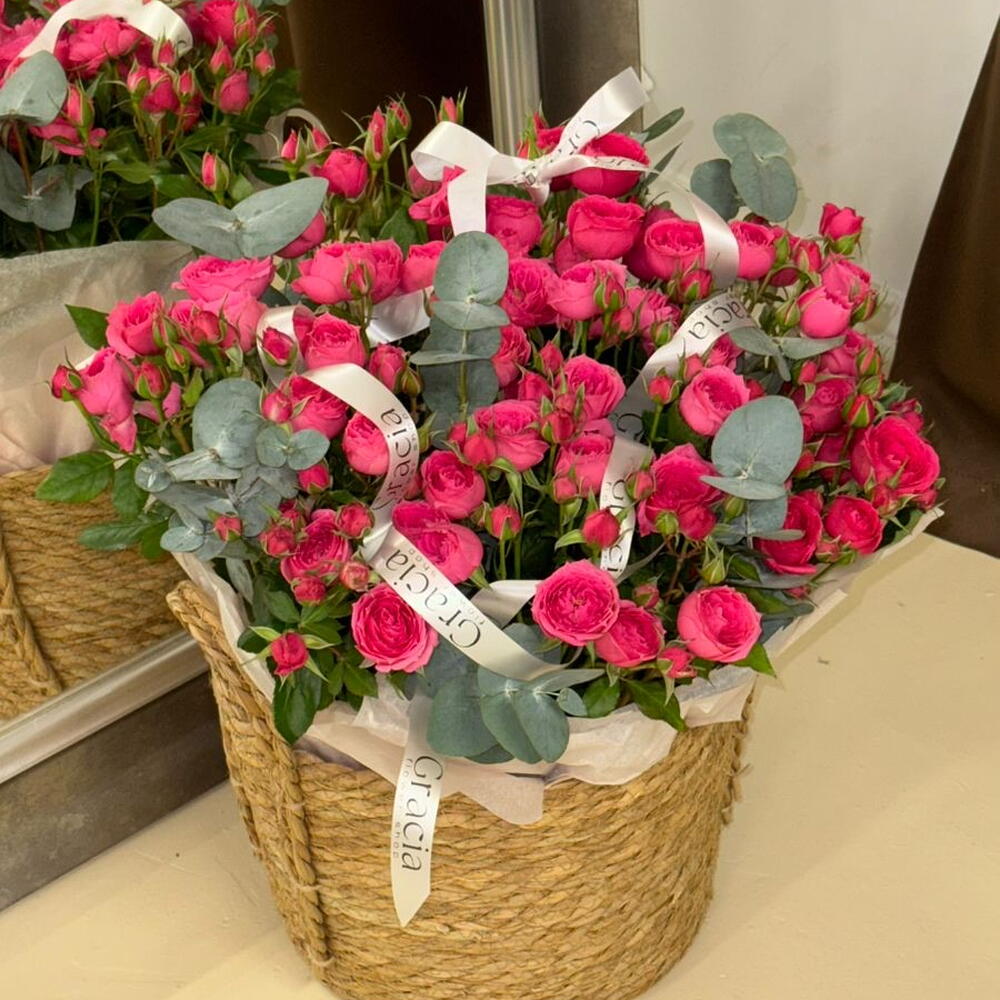 Оазис флористический - 2 шт. Эвкалипт Цинерея - 2 шт. фирменное оформление - 1 шт. кашпо ротанг - 1 шт. sofie кустовая роза - 11 шт.