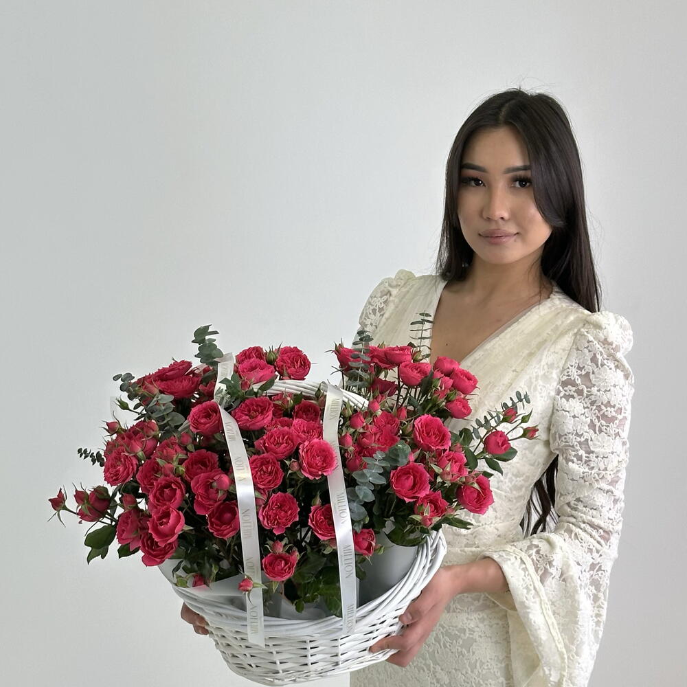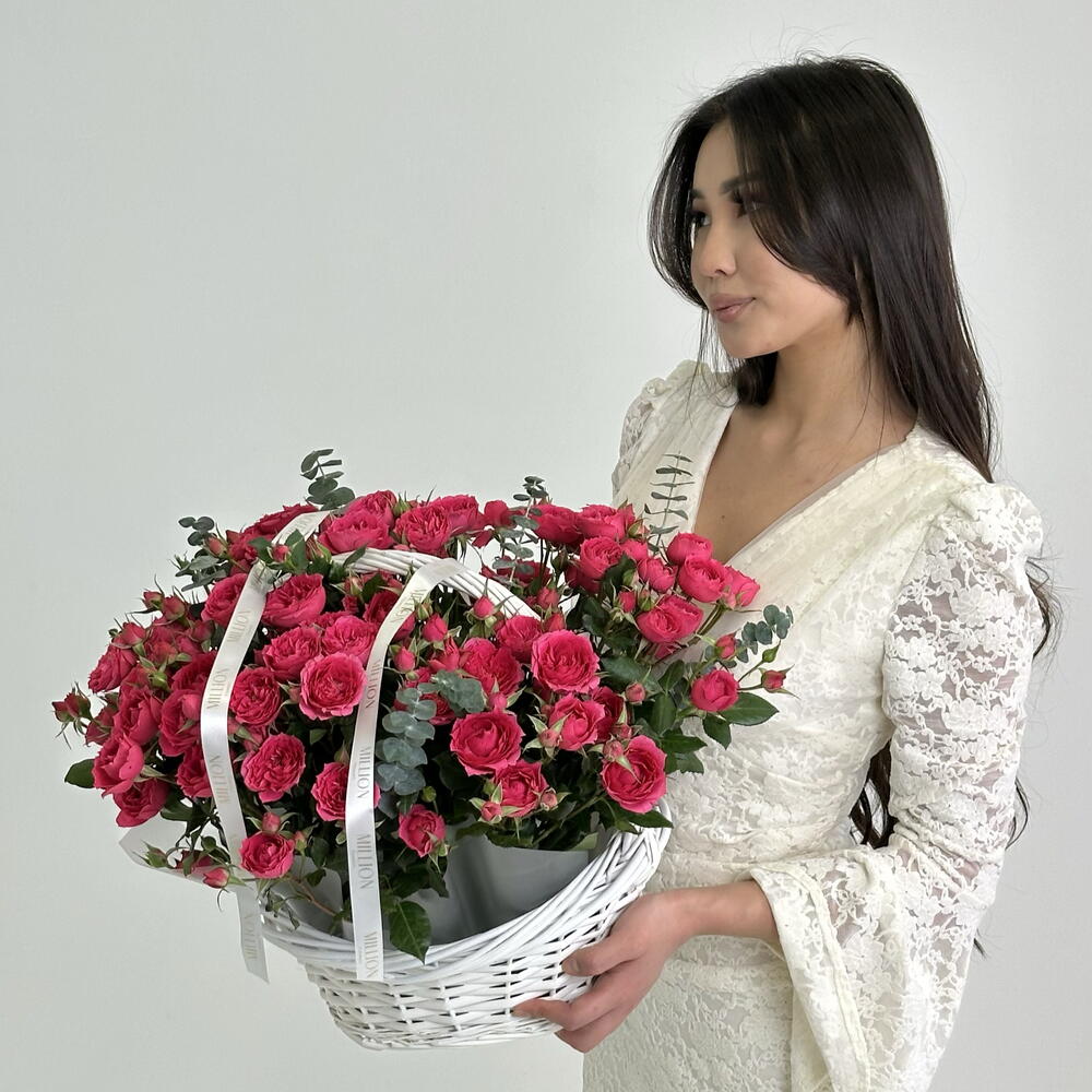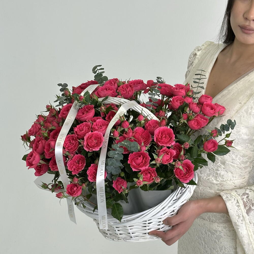 Кустовые розы в корзине Нежная композиция из свежих кустовых роз в стильной корзине — изящный подарок, который создаёт атмосферу уюта и заботы. Множество миниатюрных бутонов формируют пышный объём и долго радуют своей свежестью и красотой. Флористы Million.floral собирают каждую композицию вручную перед доставкой, используя только свежие цветы высокого качества. Корзина подчёркивает форму букета и делает его готовым подарком для любого повода.